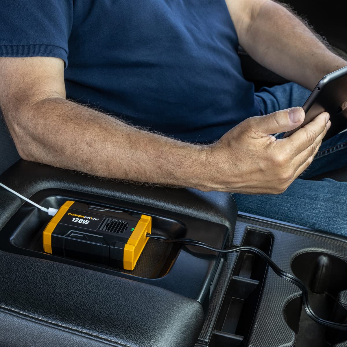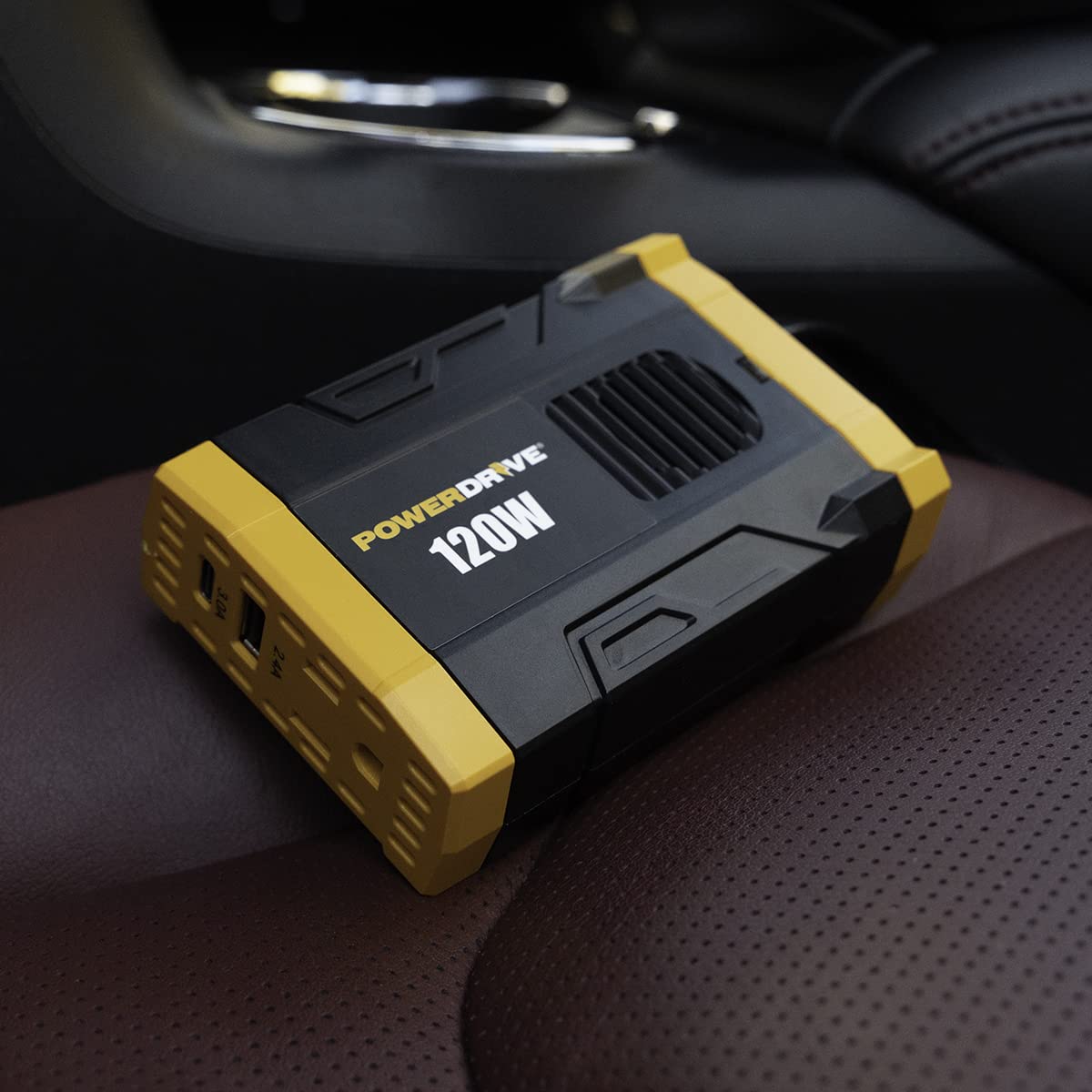 Keep the PowerDrive 120W power inverter in your car or truck to charge your phone and other small electrical devices while on the road. This slim design power inverter is able to power AC devices rated up to 100 watts with continuous power. You can power multiple appliances using the single AC outlet and 2 USB ports on this car inverter. Converts 12v to 110v. Battery to inverter cables are an ample 36 inches long. A great gift for travelers or anyone who tailgates and camps. Use this DC to AC cigarette lighter socket adapter to power small appliances and laptops and more. Perfect for on-the-go. Surge power is 250 watts. This power inverter comes with short circuit and temperature protection plus overload protection for peace of mind.