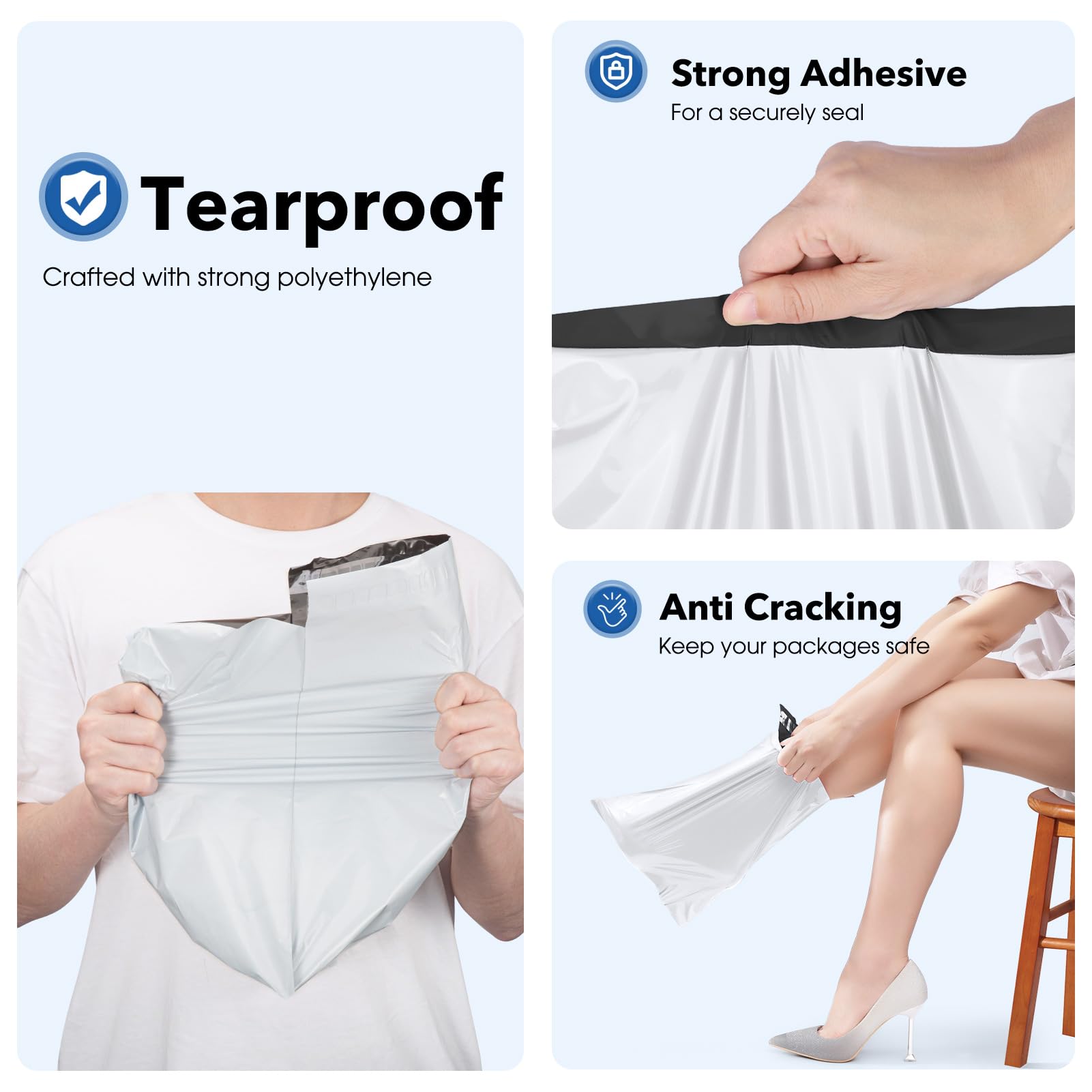 Strong Adhesive Self Sealing Mailers-Each large mailing envelope contains a strong adhesive self-sealing strip.The strong stickness prevents your items from being secretly replaced during transportation.Simply peel and fold over to seal each package safely and securely.