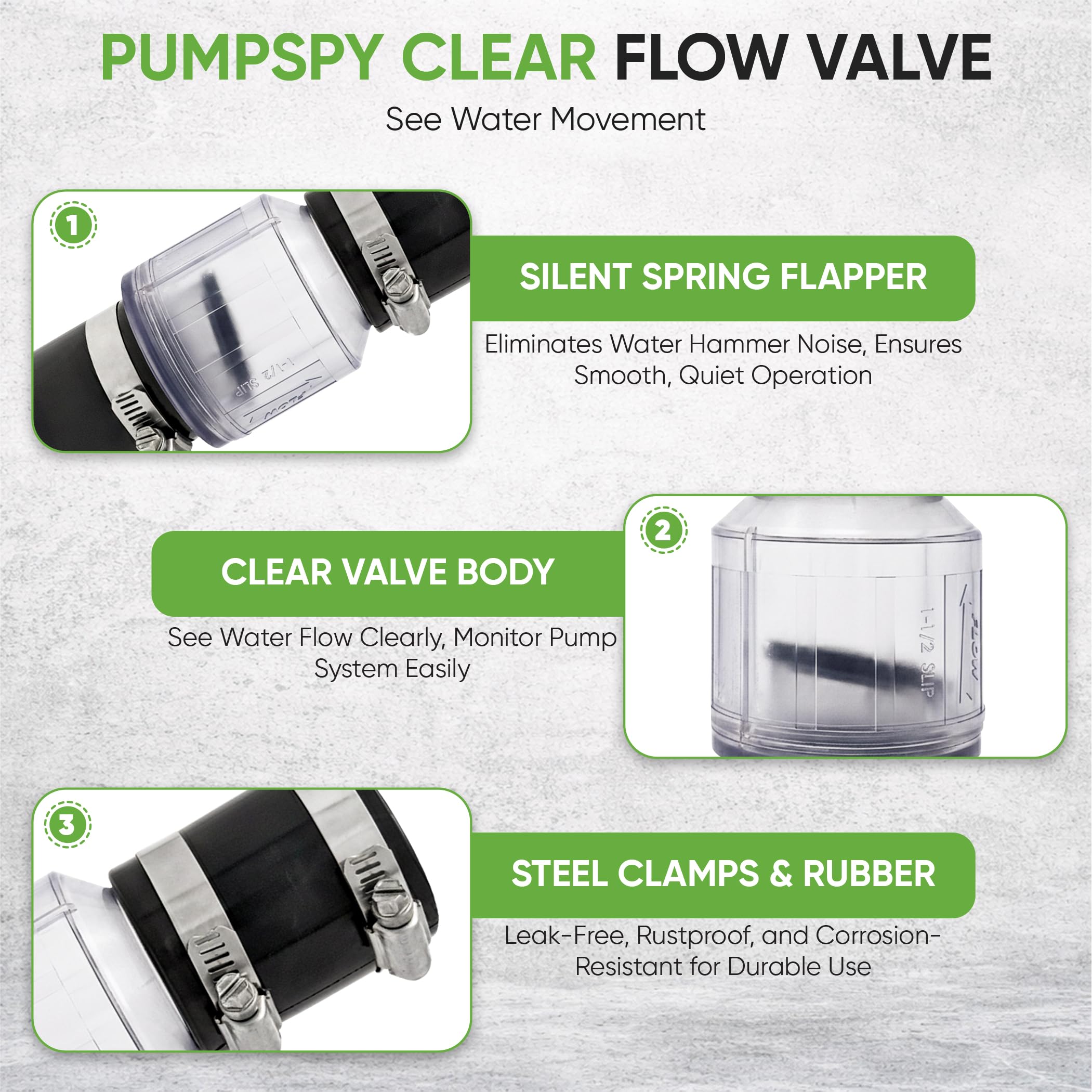 PumpSpy's Silent Sump Pump Check Valve brings quiet operation and visibility to your sump pump system. This check valve is designed to allow maximum water flow from your pump. The clear valve body shows if water is moving and the pump works as designed. The spring-loaded flapper keeps the operation quiet, with no jarring water hammer noises. Our sump pump check valves are made with easy installation in mind and come with stainless steel clamps and Buna-N couplings that fit 1-1/2″ pipe. This sump pump check valve can quietly prevent water from being pumped twice and extend the life of a pump. Product Specs: Model: CV-150, 1 1/2 inch check valve, spring-loaded flapper Dimensions: 8.5 x 3 x 3 inches; Weight: 12.8 ounces.