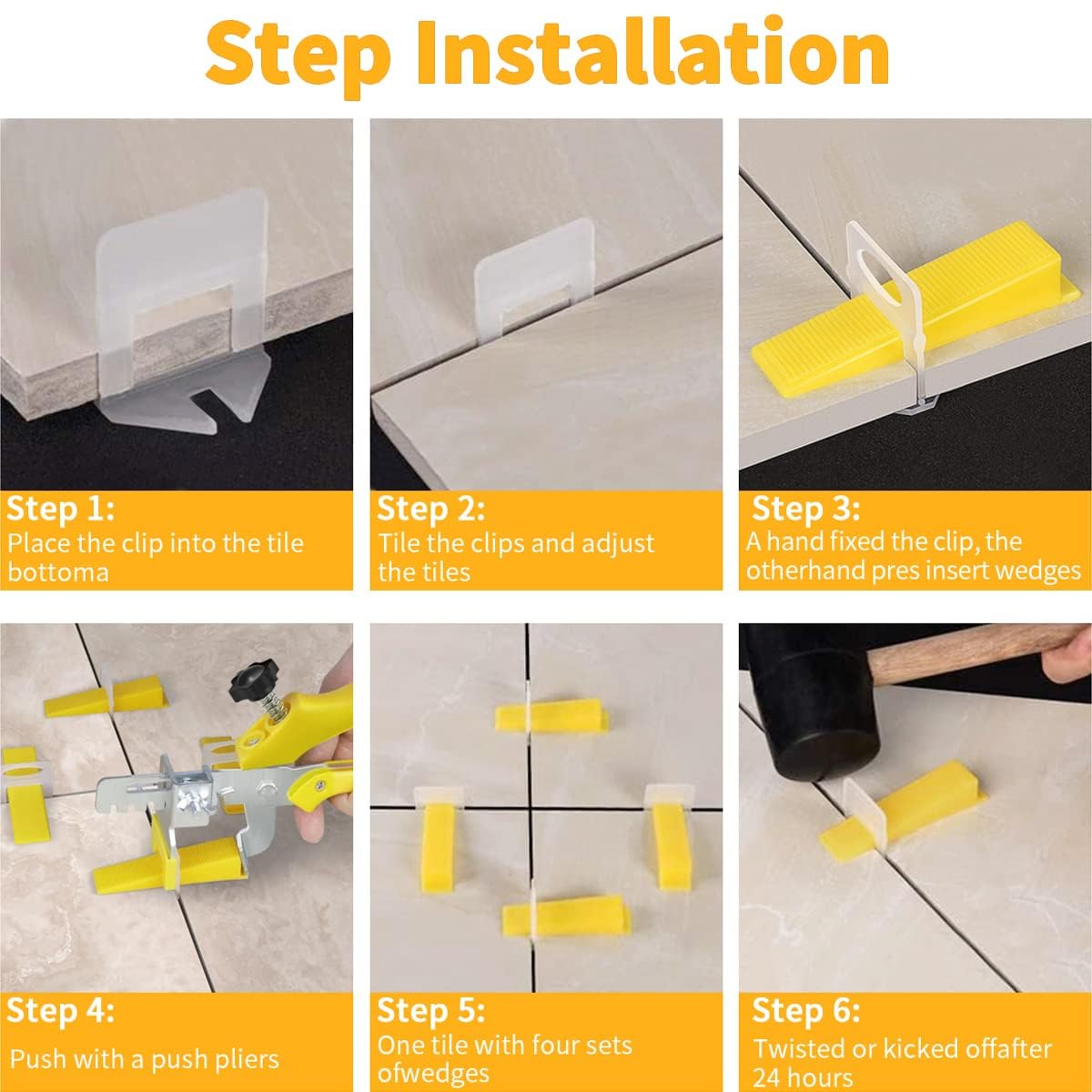 Package Includes: 1200-Piece Leveling Spacer Clips and 300-Piece Reusable Wedges and 1 Tile Plier. Our Tile push pliers help you clamp the wedge and clips quickly, making the tiles more flat and save time