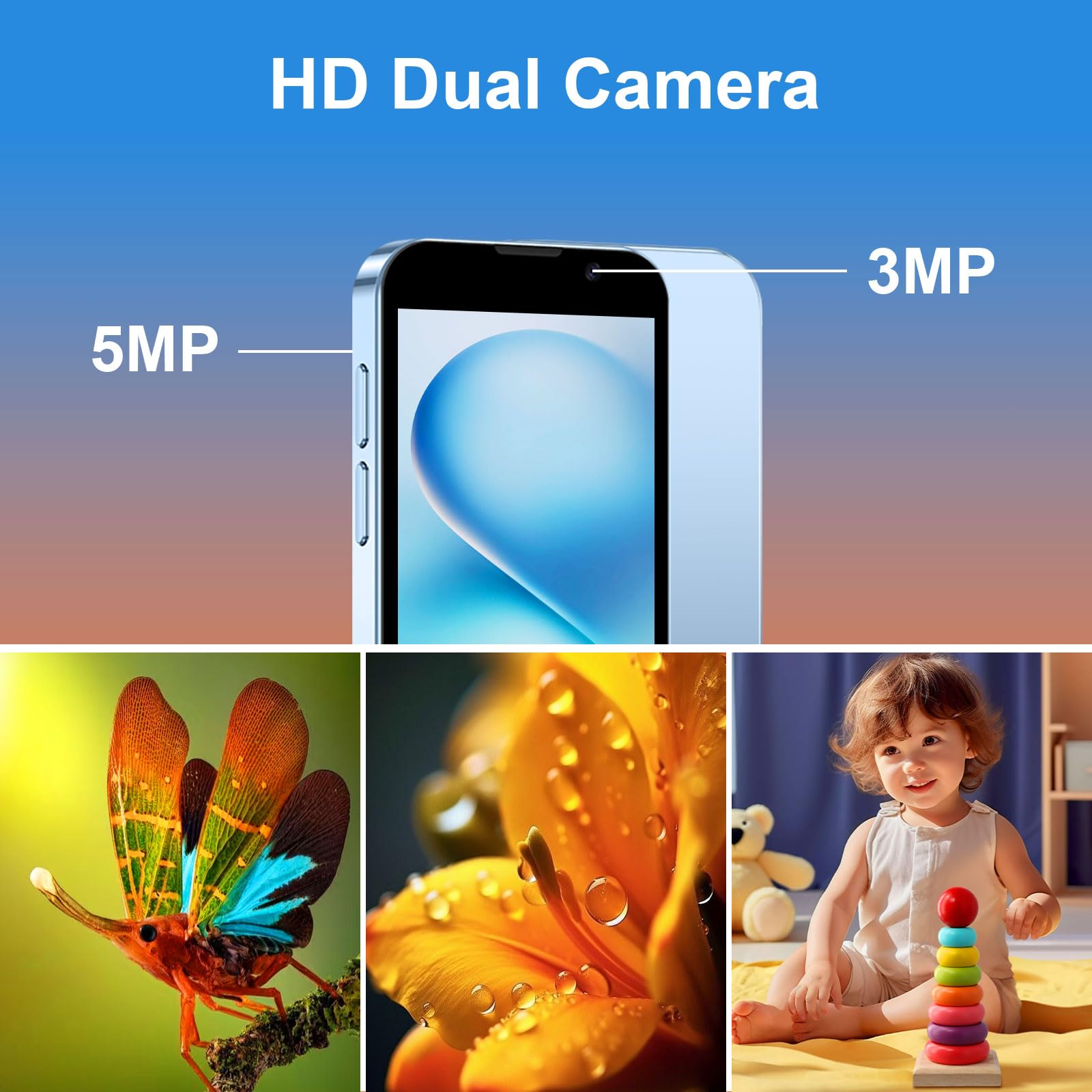 3.Dual Cameras & Smart Security–Capture Memories, Safely: This little phone comes with a 3MP front camera for selfies and 5MP rear lens for adventures, letting them snap life’s moments with clarity. Especially as a mini phone for kids, its facial recognition feature keeps their photos and data secure-perfect for young users. It’s not just a gift; it’s a way to preserve memories safely.