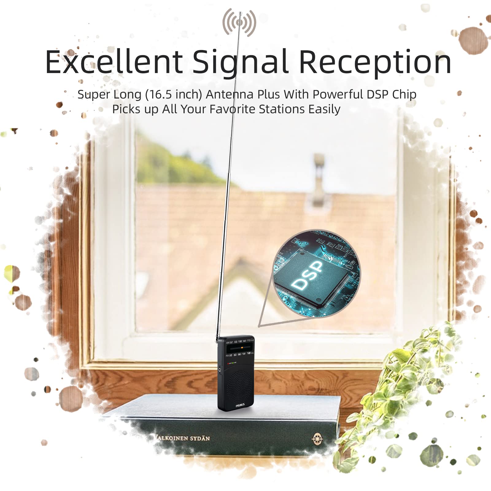 【Excellent Signal Reception】FM: 87-108 MHz, AM:520-1730 kHz; I guess a small radio with excellent signal reception definitely can capture your heart, right? Our handheld radio is the right one. It’s not only equipped with 16.5 inch long 360° adjustable antenna, but built in advanced DSP chip. No matter which city or even a remote area you’re in, you can get the local stations easily.