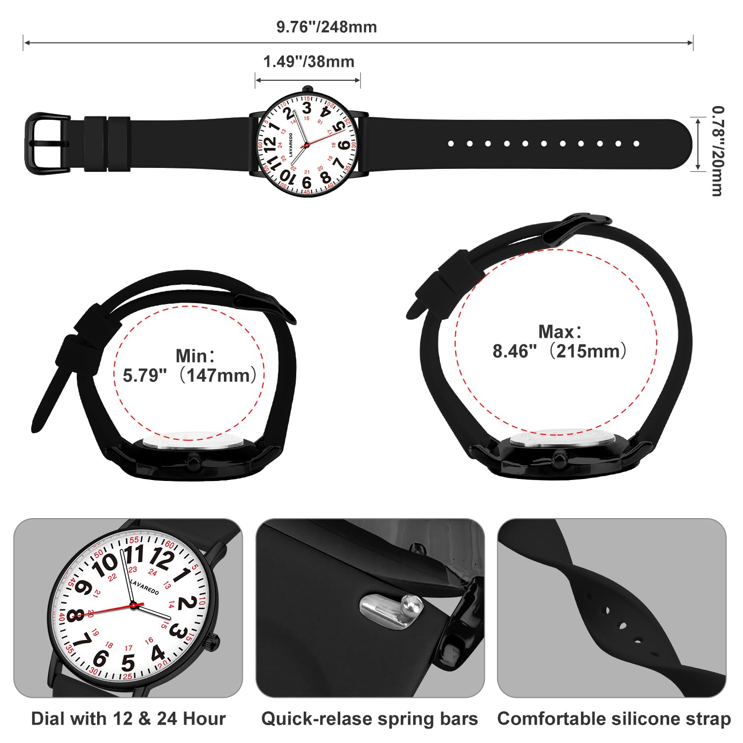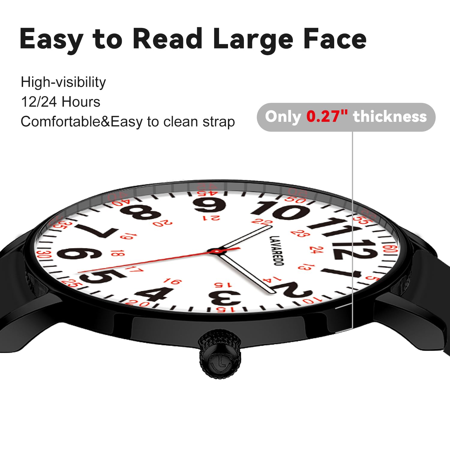 EasyRead & Military Time:Easy-to-read dial with 12/24 hour,luminescent face and MINUTE/HOUR hand for night-time visibility.The soft silicone strap is extremely comfortable to wear and the lightweight size is perfect for use at work
