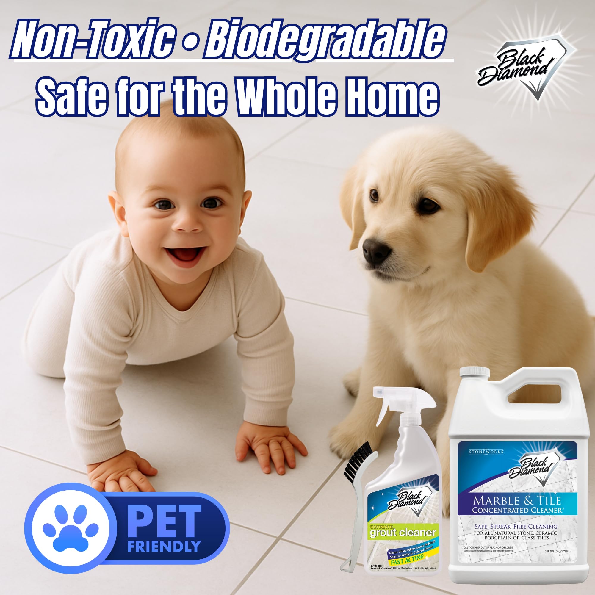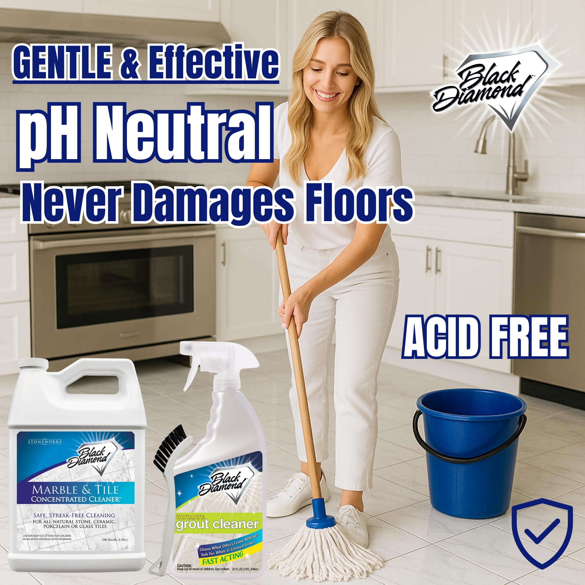 This 2-pack bundle provides everything you need to keep your natural stone and tile surfaces looking their best. The Marble & Tile Cleaner (Gallon) is a gentle, pH-neutral formula safe for marble, granite, travertine, slate, limestone, ceramic, and porcelain tile. It lifts dirt and grime without streaking or leaving residue, restoring a polished, streak-free finish. Highly concentrated, just 2–4 oz. per gallon of water is all you need for effective daily cleaning and long-lasting value. The Ultimate Grout Cleaner (Quart) with Brush penetrates deep into grout lines, removing dirt, grease, and grime to restore grout’s original color and refresh high-traffic areas. The included brush allows for targeted application and maximum cleaning power. Perfect for kitchens, bathrooms, and floors throughout your home, this bundle combines two professional-grade cleaners for comprehensive care. Proudly made in the USA, trusted by stone care professionals, and designed to make cleaning safe, simple, and effective.