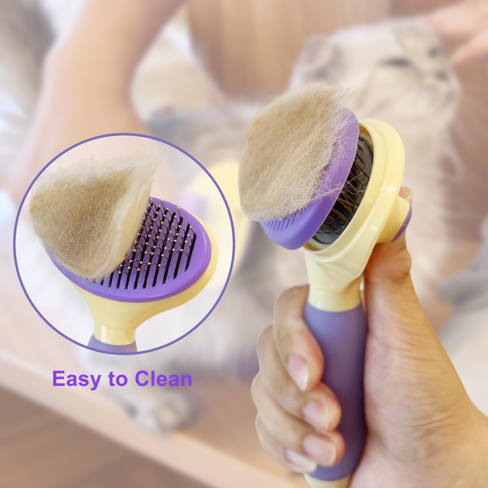 Hassle-Free Cleaning: The innovative release button allows for one-click cleaning. Say goodbye to tedious hair removal – keep your cat brush tidy and ready for the next grooming session! #selfcleaningcatbrush