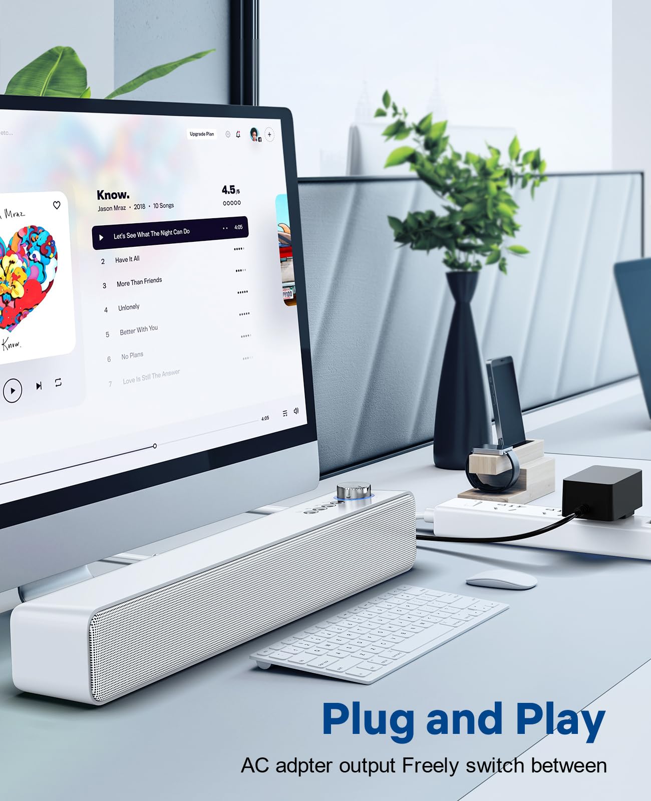 3.5mm AUX in - AC adapter powered with 59ins aux to connect, One-click connection switching. More compatibility for computers, desktops, monitors, pcs, laptops, tablets, phones.