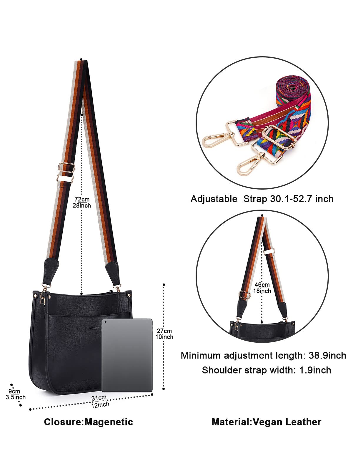 Crossbody Bag Dimension:This crossbody handbag dimension:(L) 12 x (W) 3.5x(H)10inch,weight about 0.61kg / 1.34pounds,and our leather crossbody bags for women is capable for storing many small daily necessities,such as wallet, phones,ipad,keys,cash,coins,sunglasses and makeup accessories,meet your large capacity needs