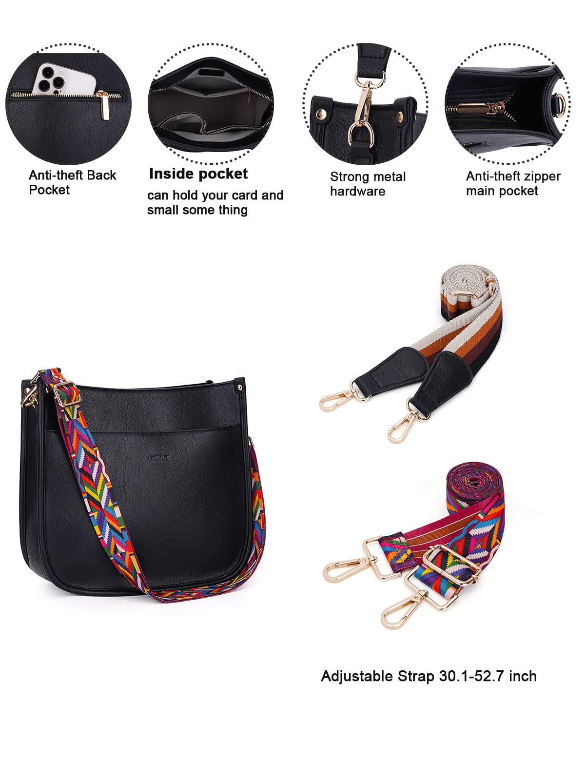 Crossbody Bag Structure:Internal structure is one main compartment including 1 main pocket,1 inner zipper pocket,2 slip pockets-cell phone pocket and ID card slot.External structure including 1 metal magnetic buckle pocket and 1 back anti-theft pockets,come with metal zipper closure,main pocket and back pocket antitheft zipper design-double antitheft to protect your property safety