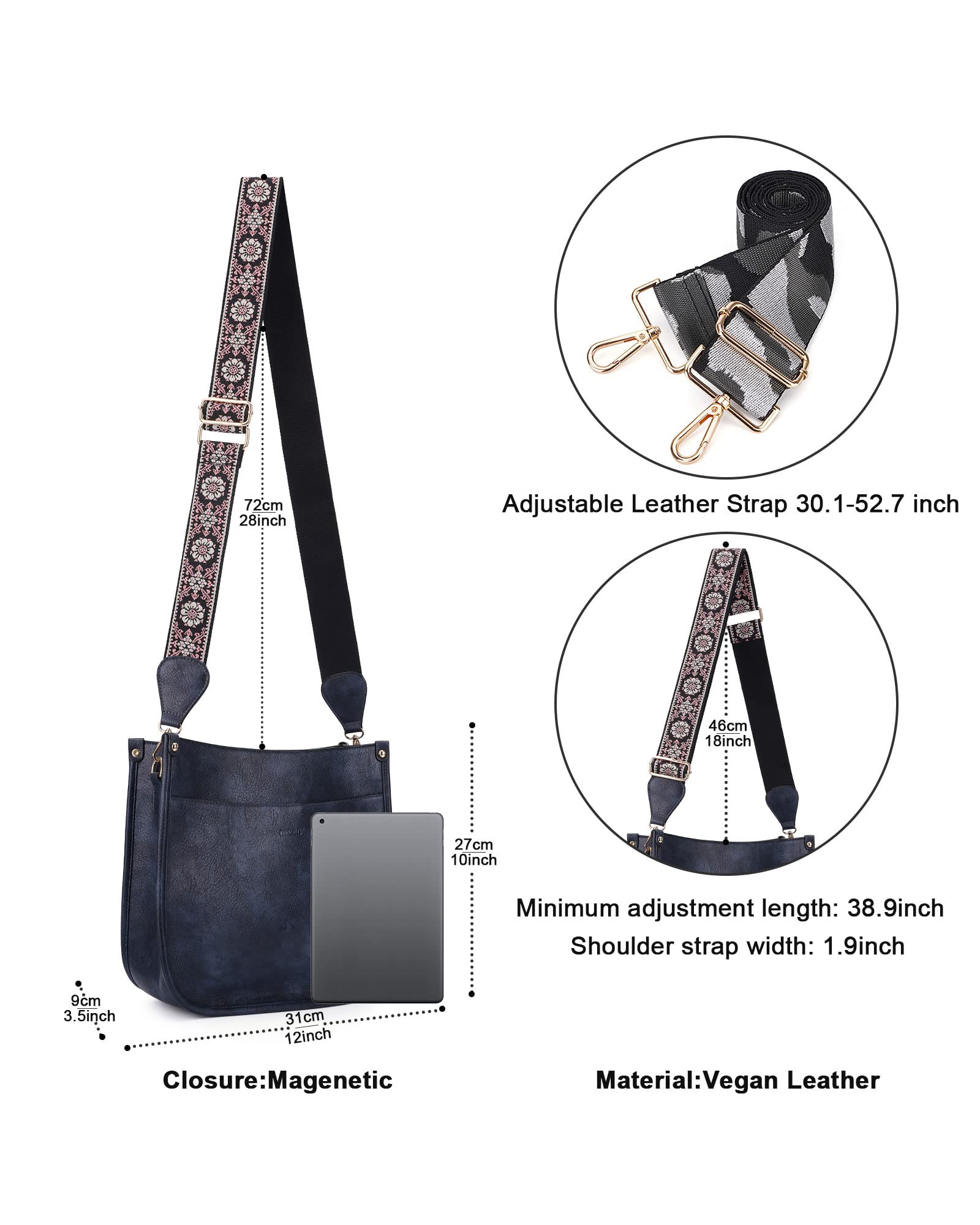Crossbody Bag Dimension:This crossbody handbag dimension:(L) 12 x (W) 3.5x(H)10inch,weight about 0.61kg / 1.34pounds,and our leather crossbody bags for women is capable for storing many small daily necessities,such as wallet, phones,ipad,keys,cash,coins,sunglasses and makeup accessories,meet your large capacity needs