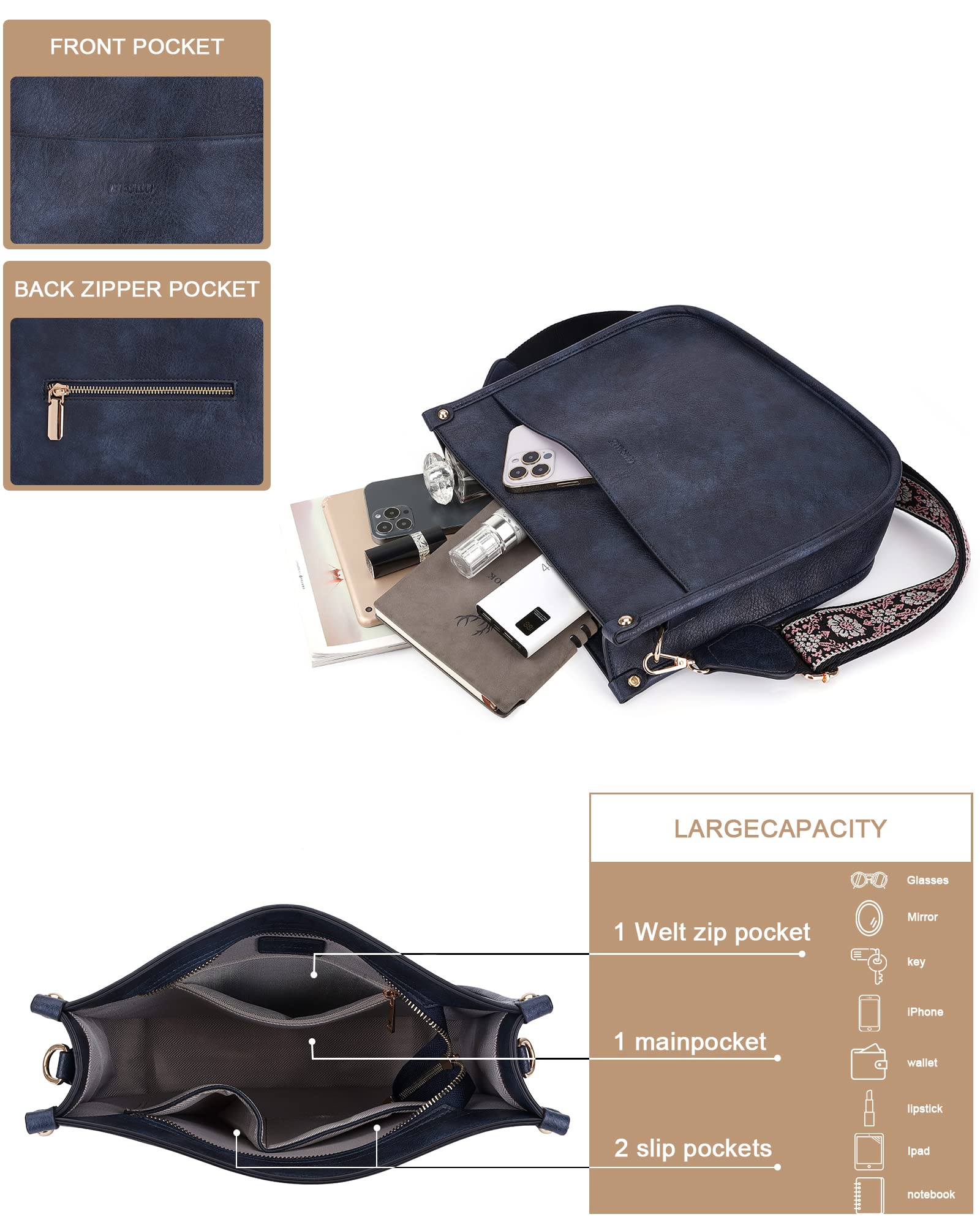 Crossbody Bag Structure:Internal structure is one main compartment including 1 main pocket,1 inner zipper pocket,2 slip pockets-cell phone pocket and ID card slot.External structure including 1 metal magnetic buckle pocket and 1 back anti-theft pockets,come with metal zipper closure,main pocket and back pocket antitheft zipper design-double antitheft to protect your property safety
