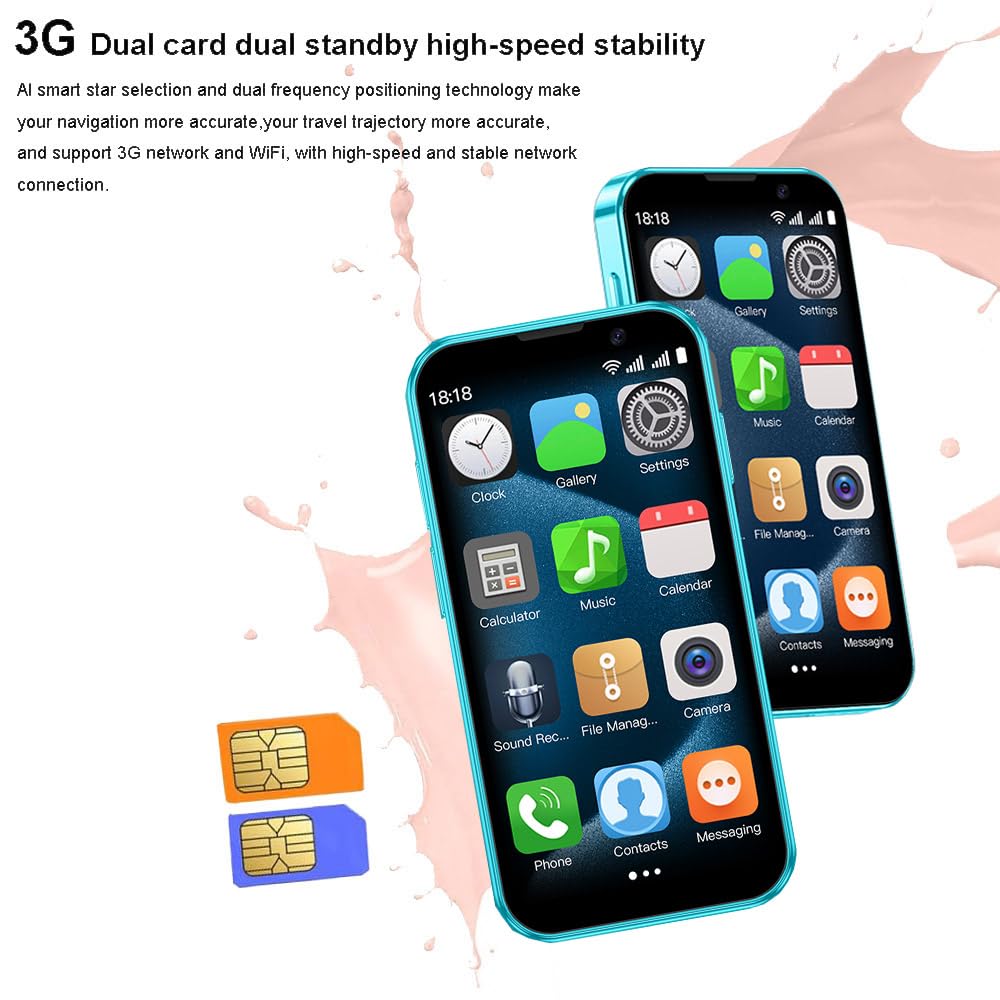 【Tiny But Functional Smartphone】-Phone Size is 94*47.4*12.5 mm. 3.0 Inch HD Screen. Easy to carry. The mini smartphone supports voice calls, video calls, camera, recording, email, MP3, GPRS, FM radio, touch screen, GPS navigation, message, SMS, MMS, video player, memory card slot, Internet browser, Google map, etc.