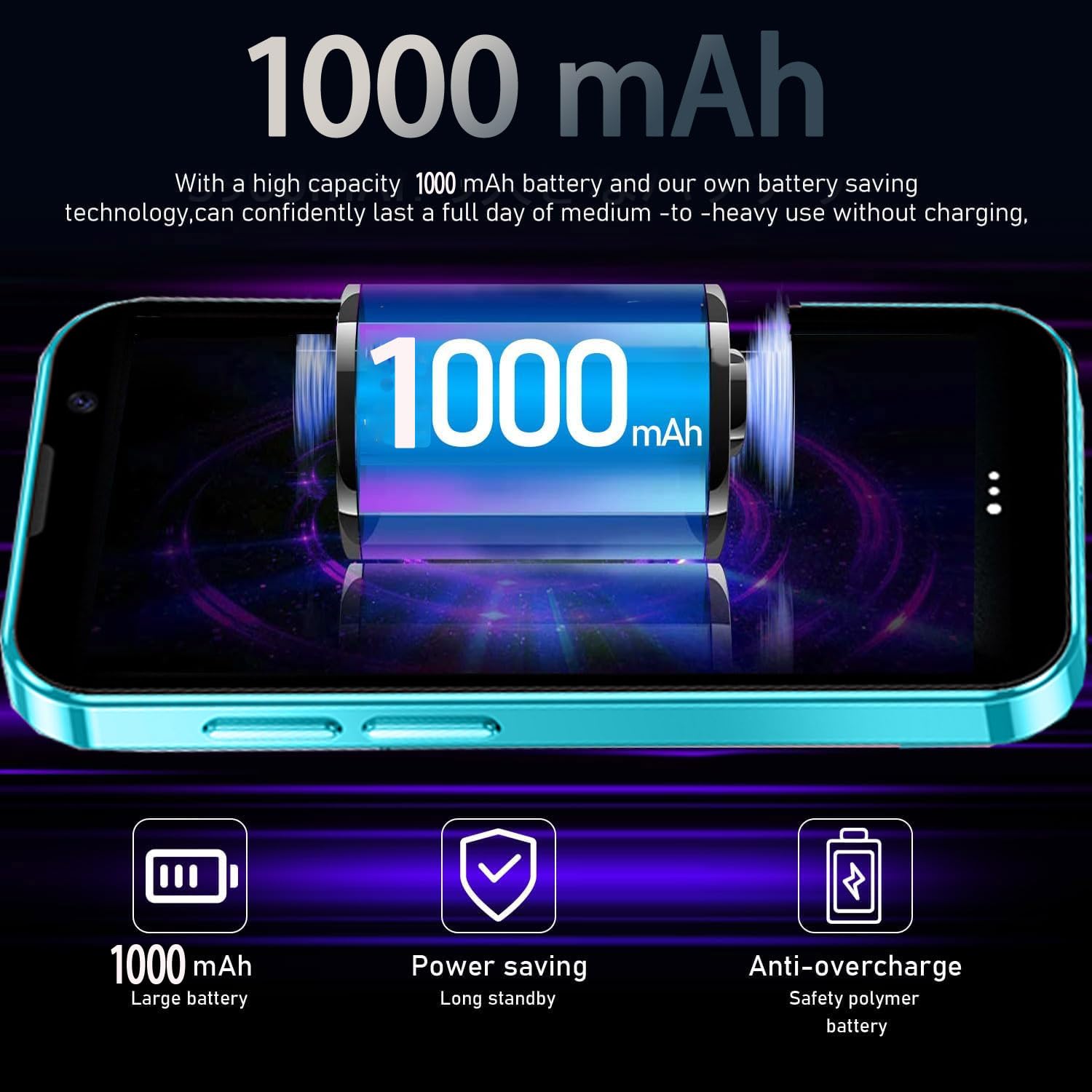 【Smartphone with 1000mAh Battery】-The battery capacity of this smartphone is 2000mAh. It also supports voice calls, video calls, photography, recording, email, MP3, GPRS, FM radio, touch screen, GPS navigation, messaging, SMS, MMS, video player, memory card insertion trough, internet browser, Google Maps, etc.