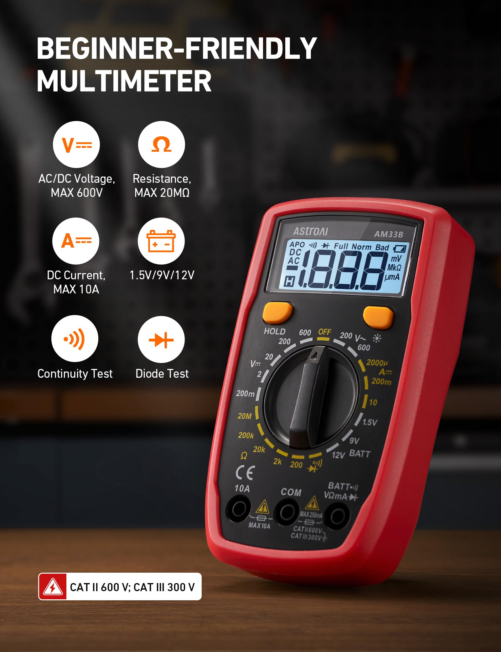 Versatile Digital Multimeter --Accurately measures AC and DC voltage, DC Current, Resistance, and Diode Testing. Features include data hold, auto shutoff, continuity buzzer, and a backlit LCD screen for easy use in dimly lit areas.