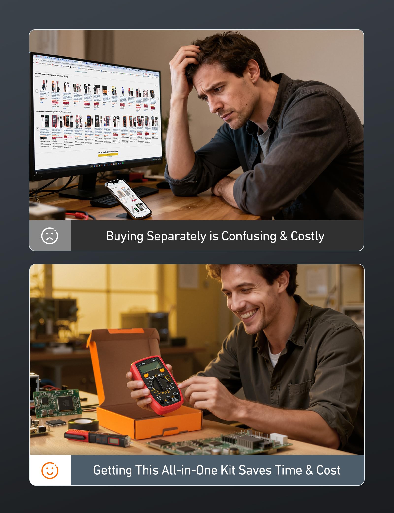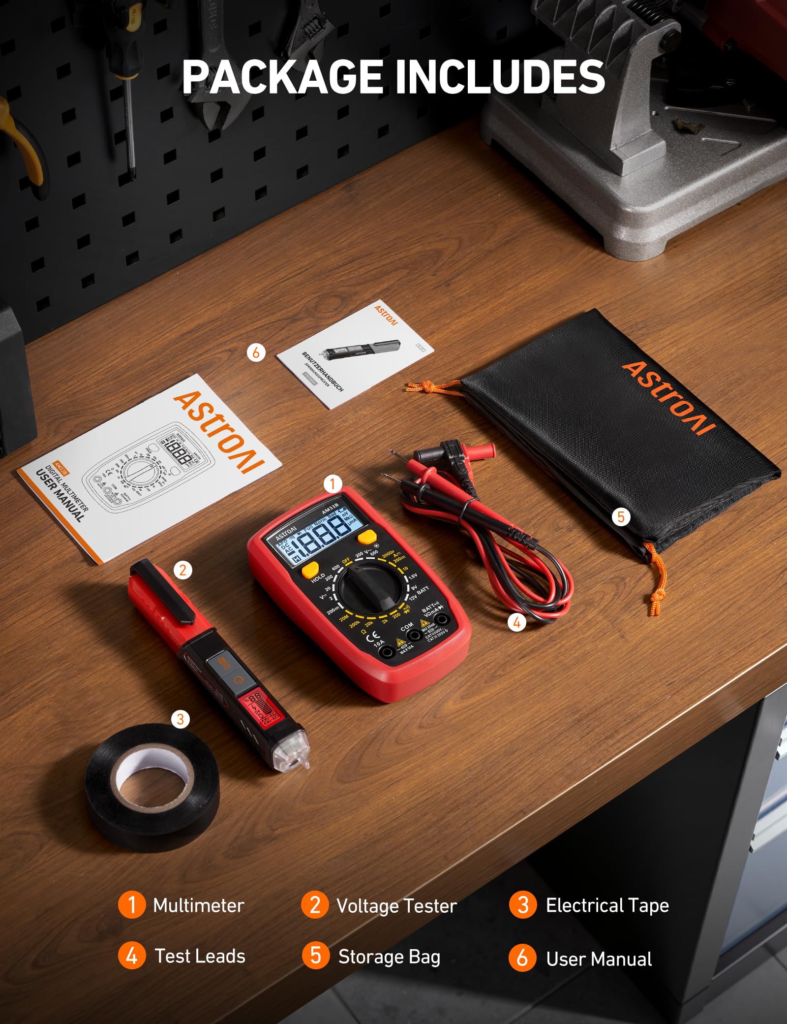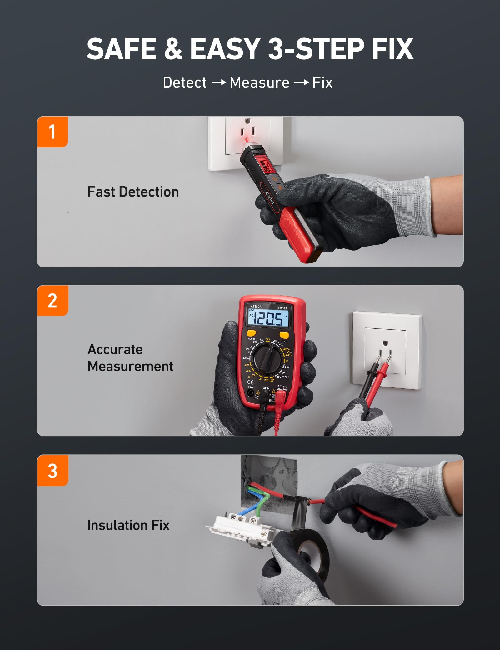 All-in-One Electrical Kit - Includes the AM33B multimeter, a VTS1000H non-contact voltage tester, and premium electrical tape. Everything you need for quick and accurate circuit testing, detection, and repair in one compact package. No need to purchase tools separately.