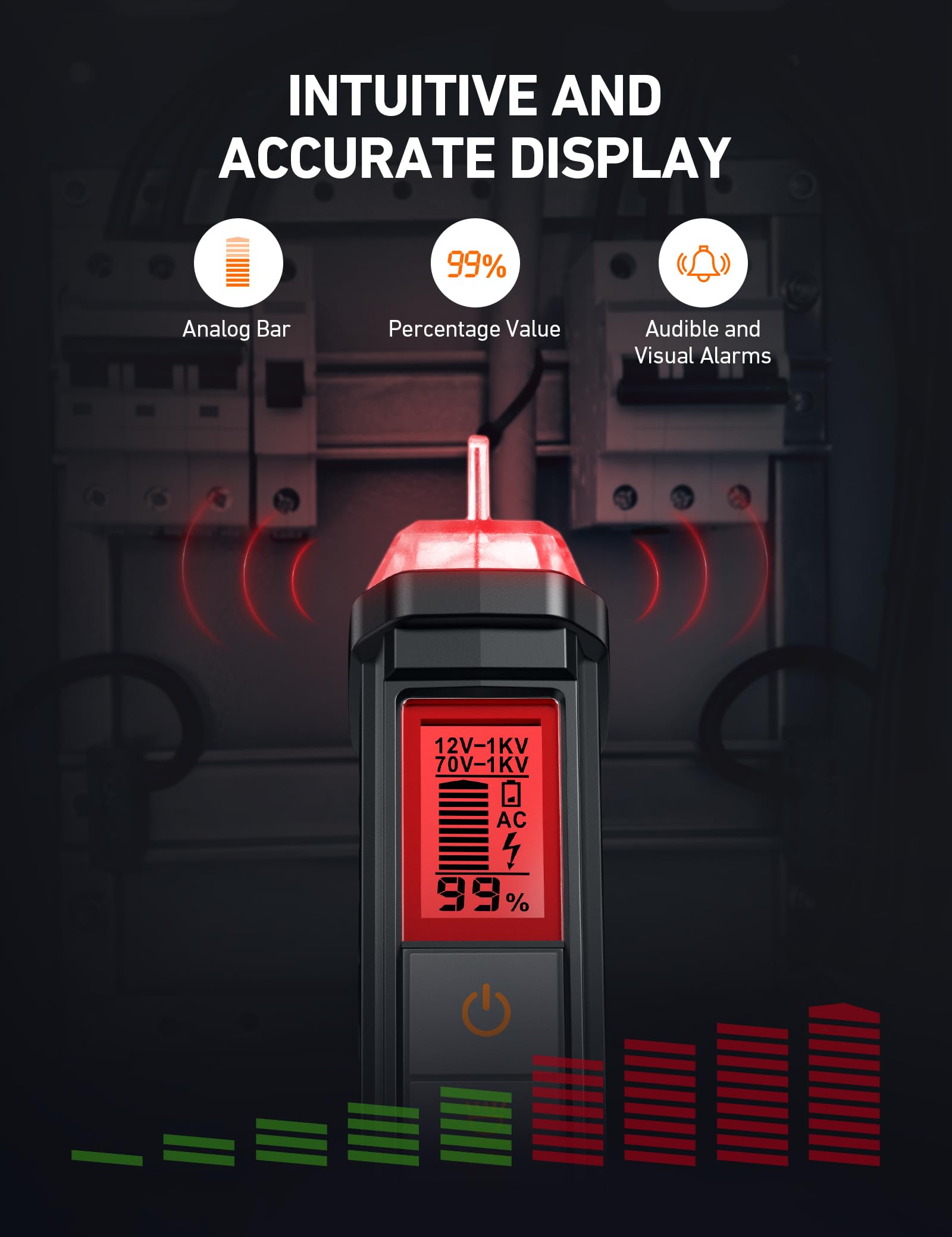 Integrated Voltage Tester & Screwdriver - Features dual sensitivity modes (12–1000V AC and 70–1000V AC) for accurate and versatile voltage detection. The intuitive LCD displays analog bar, percentage, and buzzer volume– all making it ideal for breakpoint tests. It also includes a high-strength steel screwdriver built into the tail for added convenience.