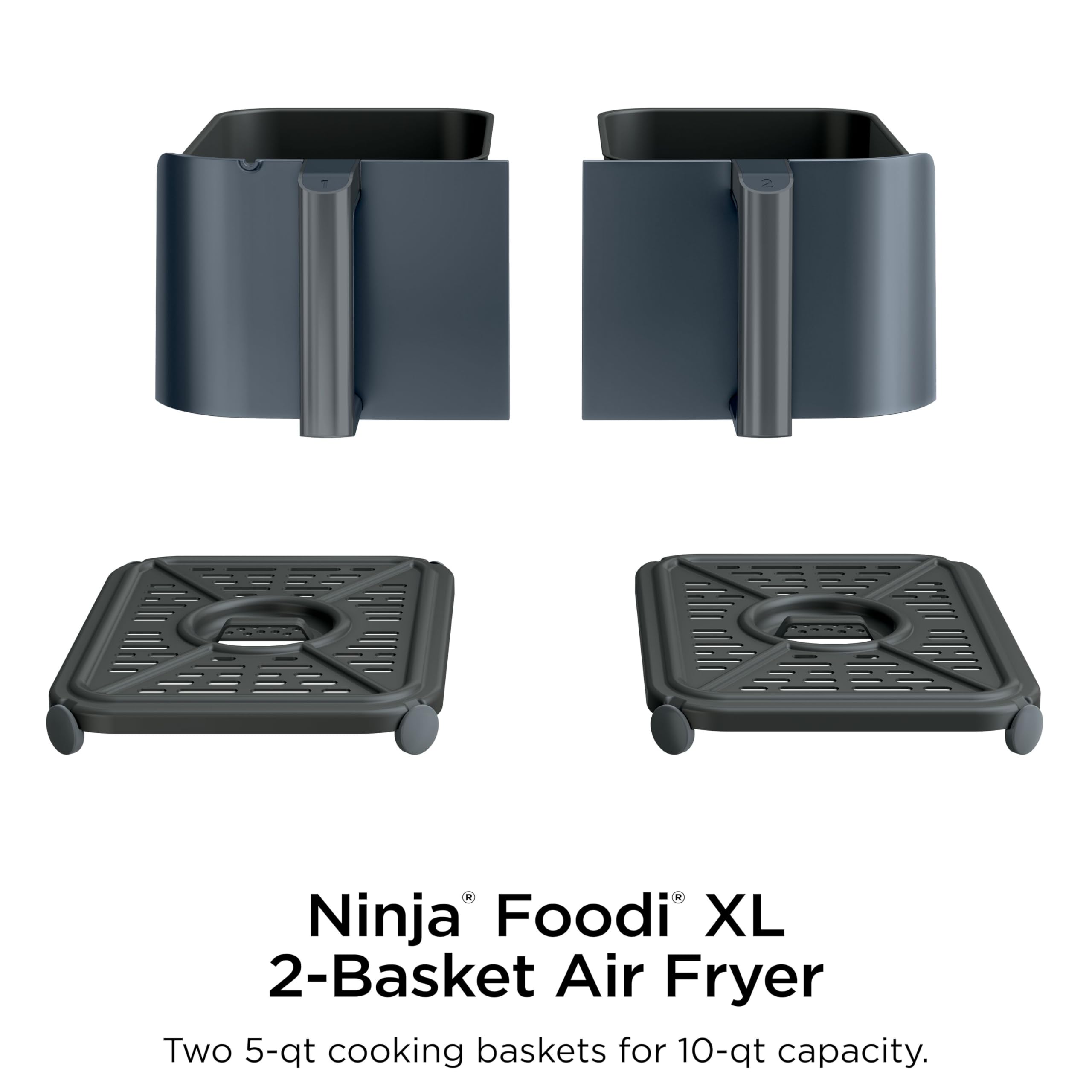 2 INDEPENDENT 5-QT. XL ZONES: They have their own cooking baskets, cyclonic fans, and rapid heaters.