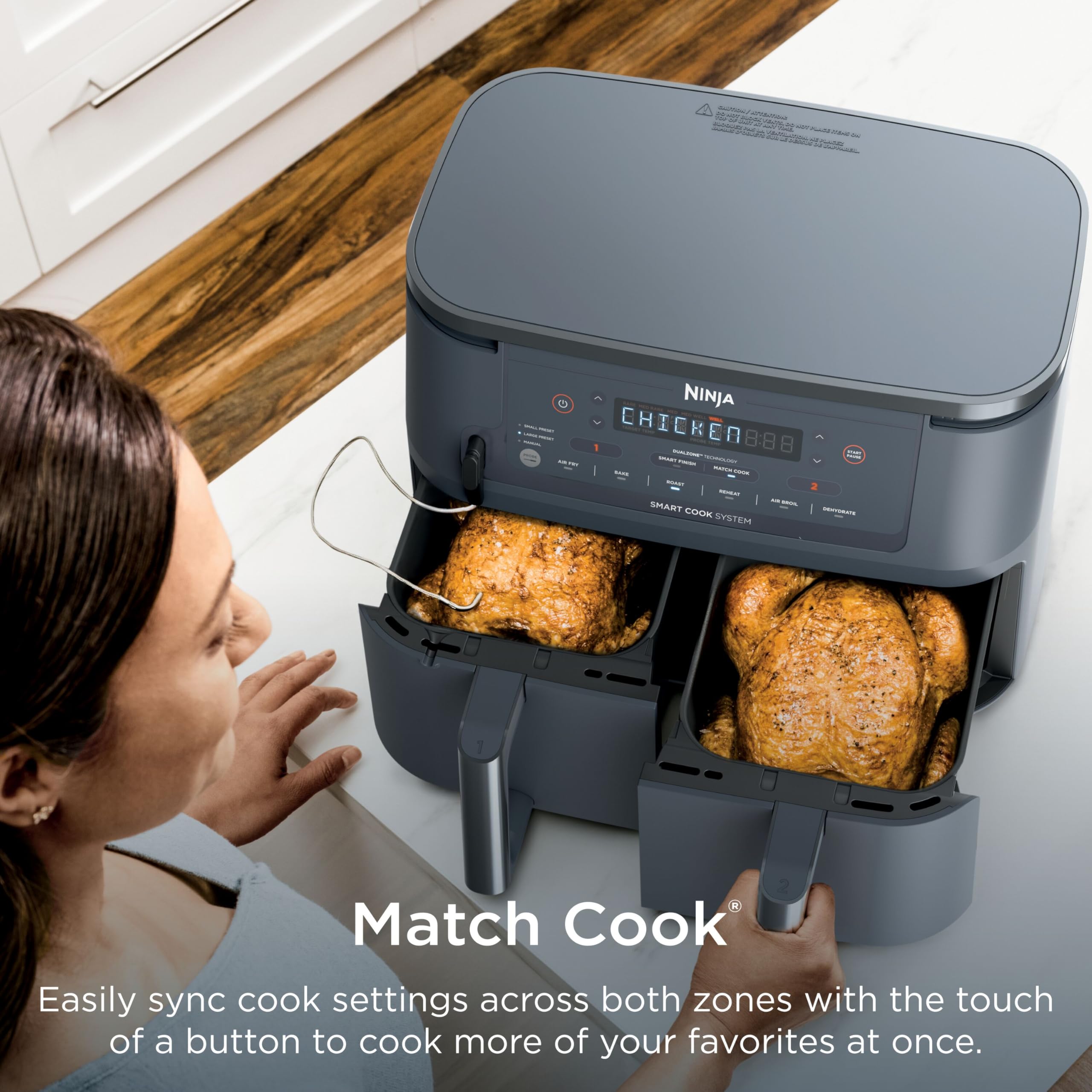 DUALZONE TECHNOLOGY: The Smart Finish feature, unlocks cooking 2 foods 2 ways that finish at the same time, or the Match Cook feature, easily copies settings across zones for full 10-qt. capacity.