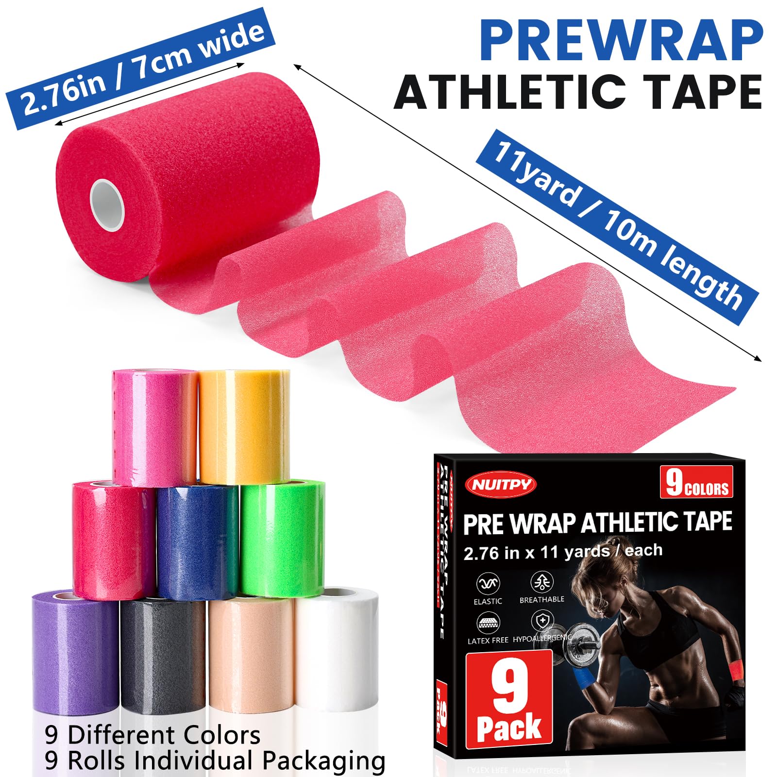 【9 Rolls Pre Wrap Tape】Package includes 9 rolls pre wrap tape. Each prewrap athletic tape is 2.76 inches wide and 11 yards long, Each roll is made of PU foam and no adhesive included, This underwrap tape set include 9 colors: blue, pink, purple, white, red, black, skin color, green, yellow, You can experience different colors every time you exercise, and you can also share different colors with friends