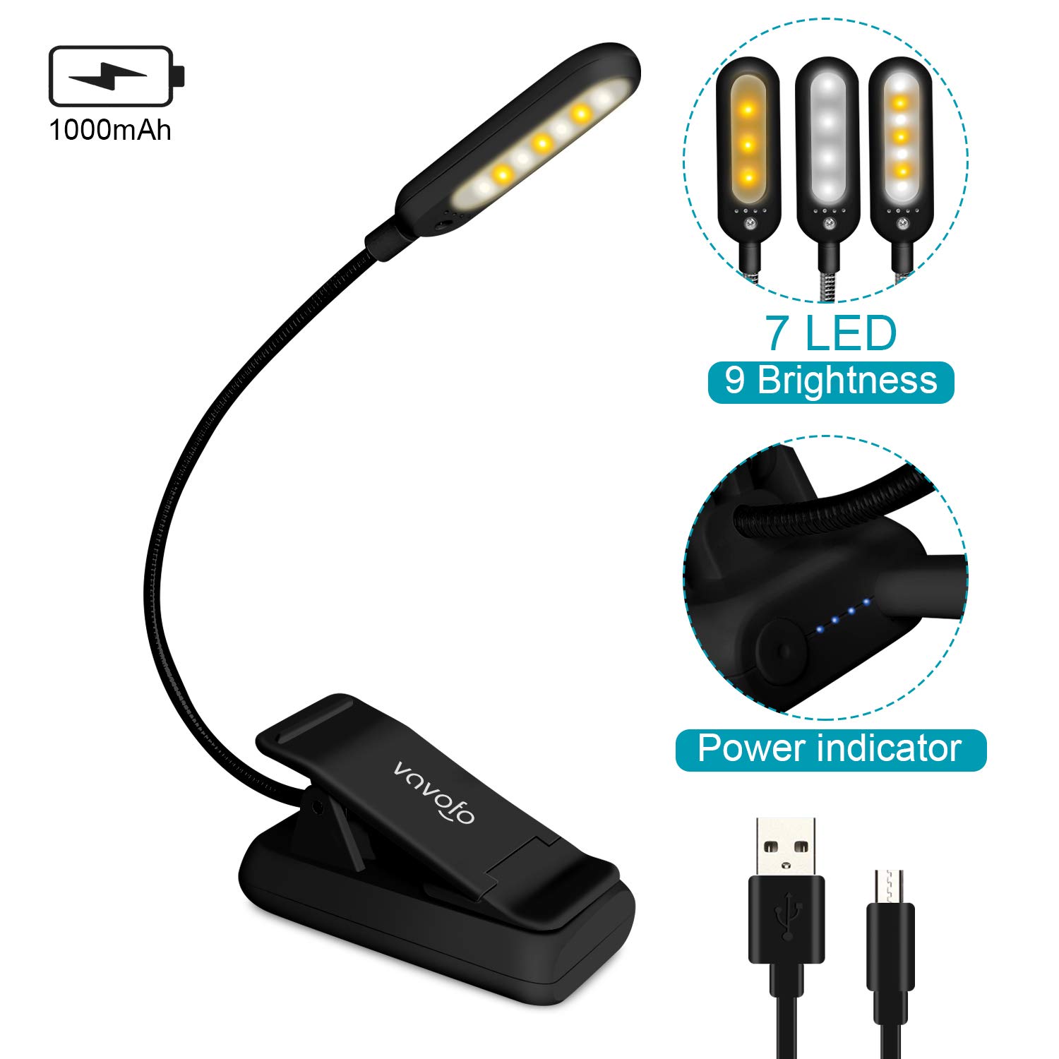 7 Leds & 9 Color Temperature - The reading lights have 7pcs leds. The book lights are equipped with 7 upgraded smd leds which life span is more than 50,000 hours to diver more uniform luminance than normal leds. The reading have 9 different color temperature modes: warm white(2800k/3000k/3200k), warm cool white(4000k/4500k/5000k) and cool white(6000k/6500k/7000k)