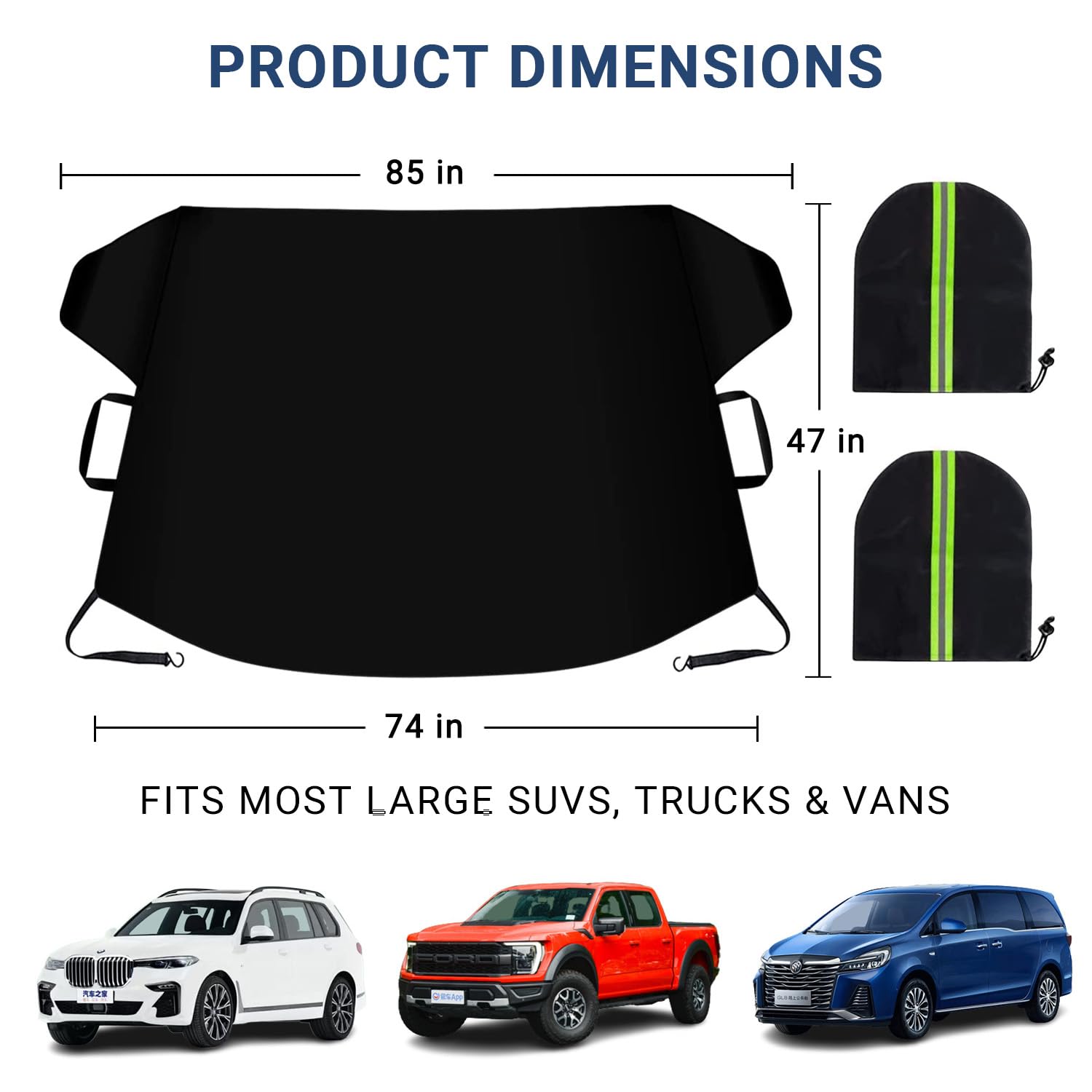 AVAILABLE IN 2 SIZES: Our winter frost guard windshield cover is available in standard/medium (63" x 47") and large sizes (74" x 47"); Medium size fits perfectly for most standard, compact cars, SUVs, and small trucks, while size Large is designed for light-duty and wider heavy-duty trucks; Besides, it comes with 2 side mirror covers with security reflective stripe to help prevent accidents at night and protects rear-view mirrors from freezing