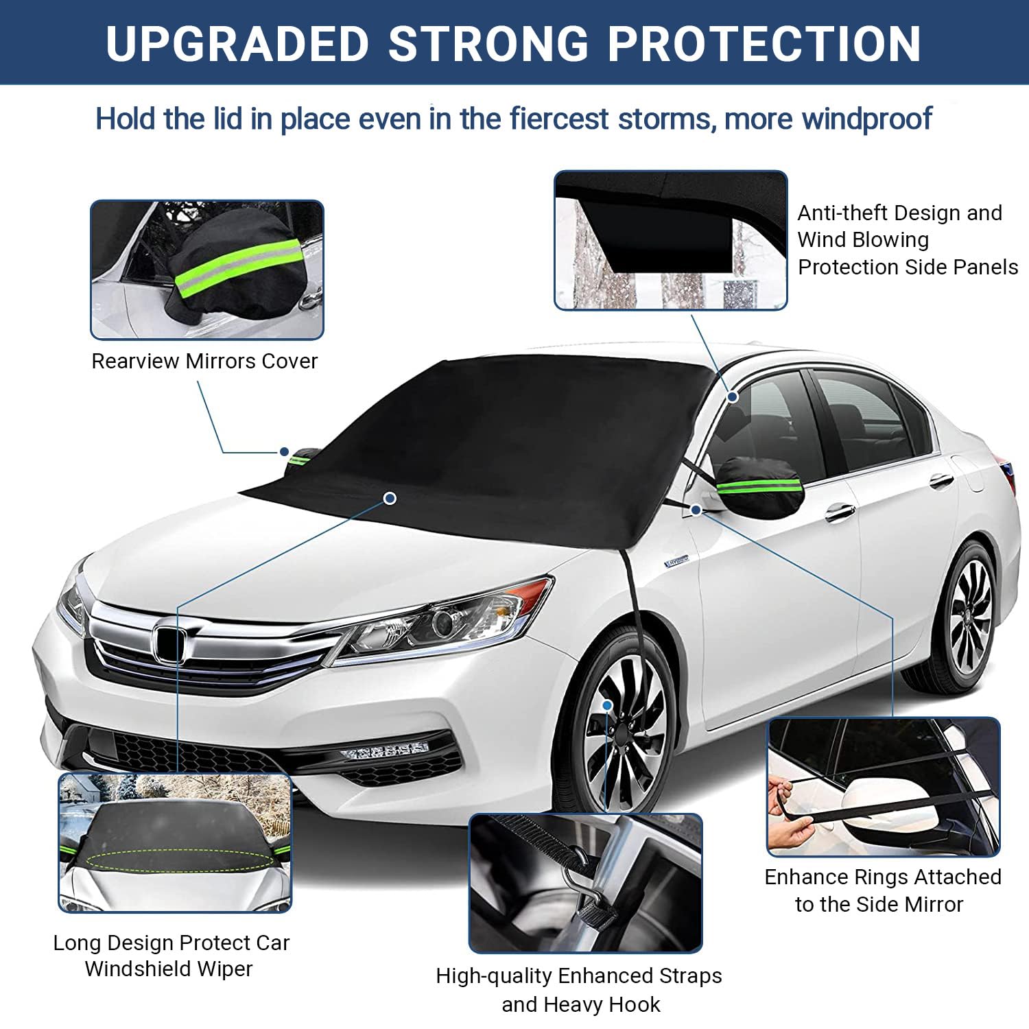 SUPERIOR WINDPROOF DESIGN: Thanks to 4 heavy duty elastic straps, 6 powerful but scratch-free magnets, and dual side flaps, our car snow cover fits secure without getting slipped or blown away, even in the roughest winds; 2 security flaps with sewn-in PVC tubes to help prevent thieves from stealing the windshield protector