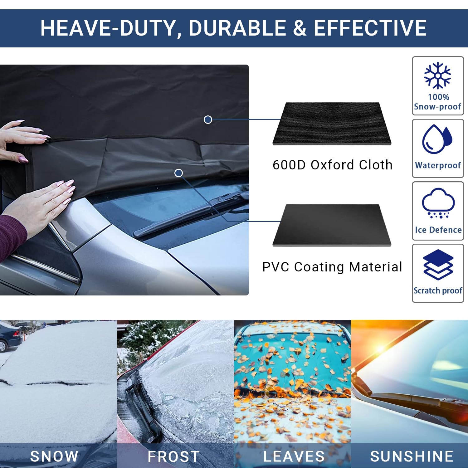 PROFESSIONAL WATERPROOF MATERIAL: Windshield snow cover is made of waterproof and durable 600D oxford fabric and the interior coating is PVC material, which features heavy-duty, tear-resistant and totally waterproof; It can effectively prevent snow, ice, rain, fog, dust and UV rays, protect windshield and wiper for all weather