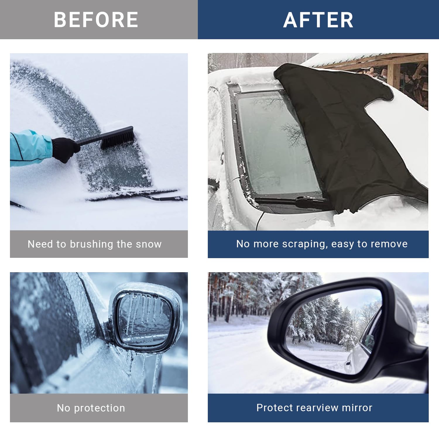 BEST CAR WINTER ACCESSORIES: Save time and fuel costs by no longer having to defrost your vehicle, scrap ice or snow in harsh winter mornings; When your car cover with heavy snow, just tear off the car snow cover to avoid froze your hand in the cold morning; It guarantees an ice and snow free windshield even under windy conditions