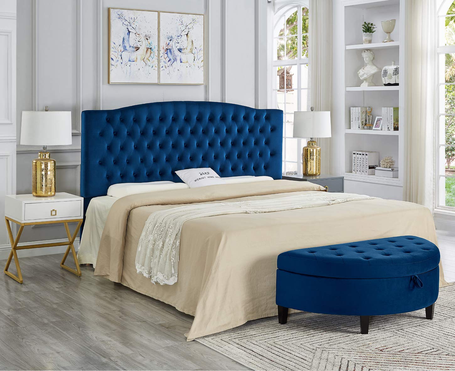 Soft velvet with button tufted headboard with curve design style in multi warm tones;