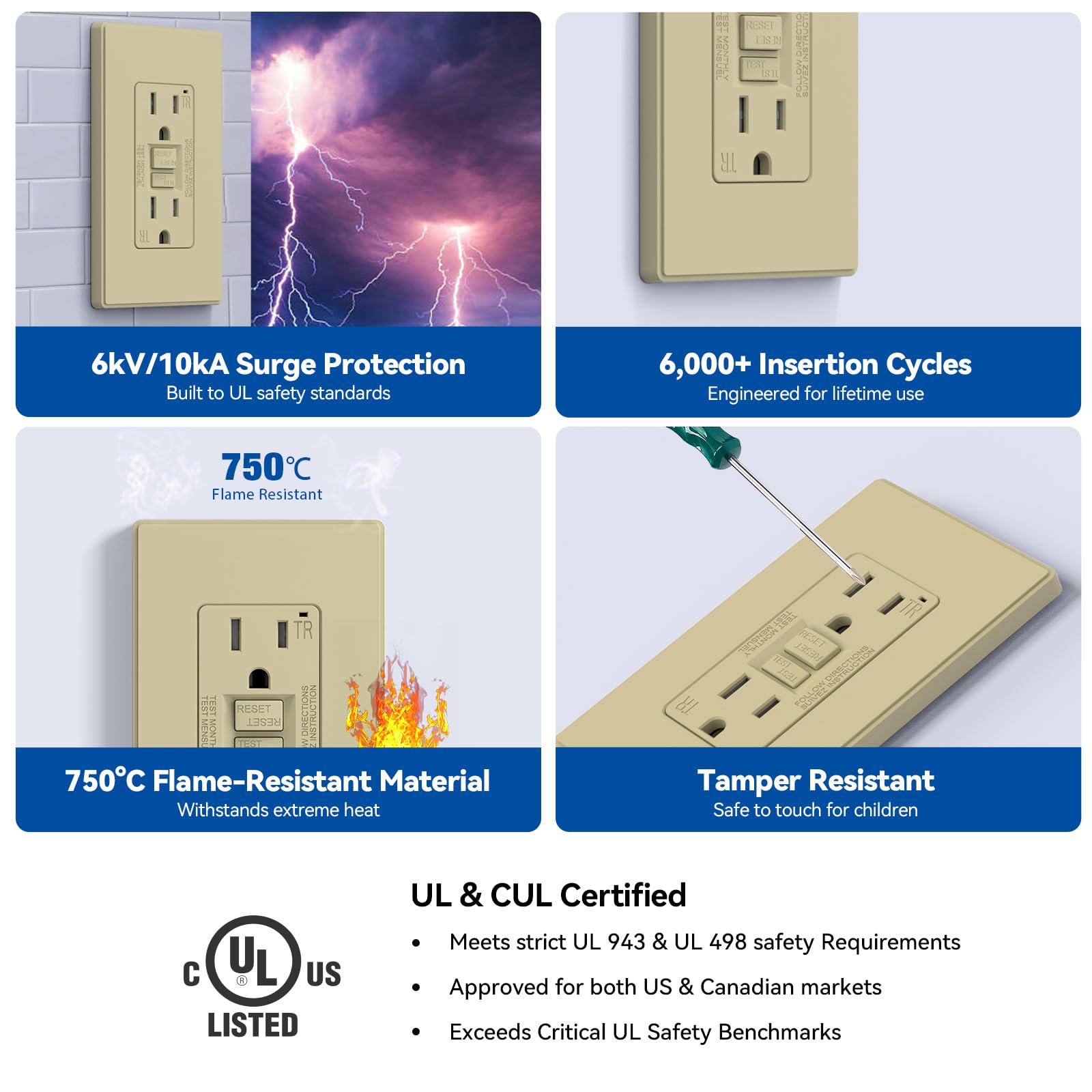 ✅【Durable and Ultra-Safe Design】Built with premium high-impact resistant thermoplastic materials. Endurance-tested over 6,000 times—twice the UL requirement. Features advanced safety features like 6kV surge protection, Reset-Disable, and Reversed Wiring Prevention to ensure long-lasting performance and maximum protection.