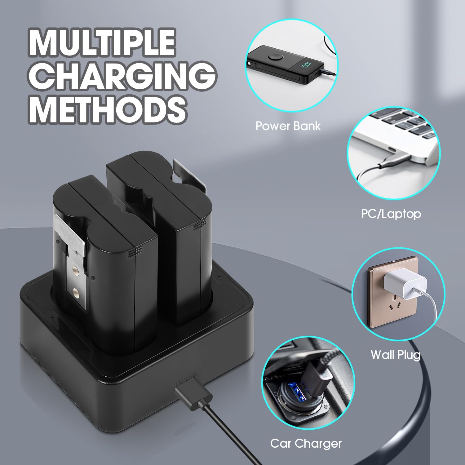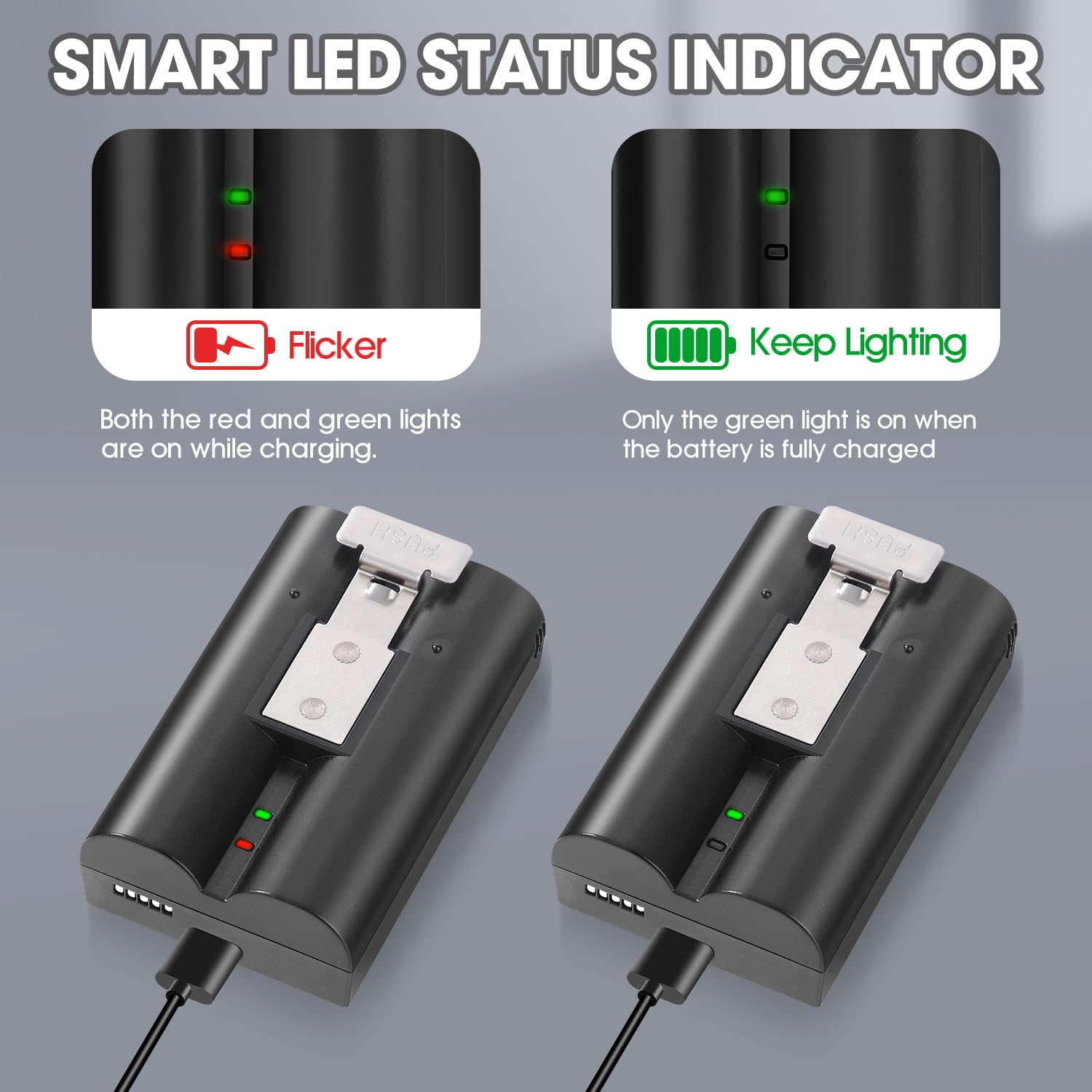 ⭐【EASY DUAL CHARGING STATION & FAST RECHARGING】:Charge two batteries at once with the included dock—minimize downtime. Hot-swap for 24/7 coverage. Also supports individual charging via any 5V USB port (PC/car/power bank) using the Micro-USB cable.Easily monitor the charging process with clear and simple LED indicators.