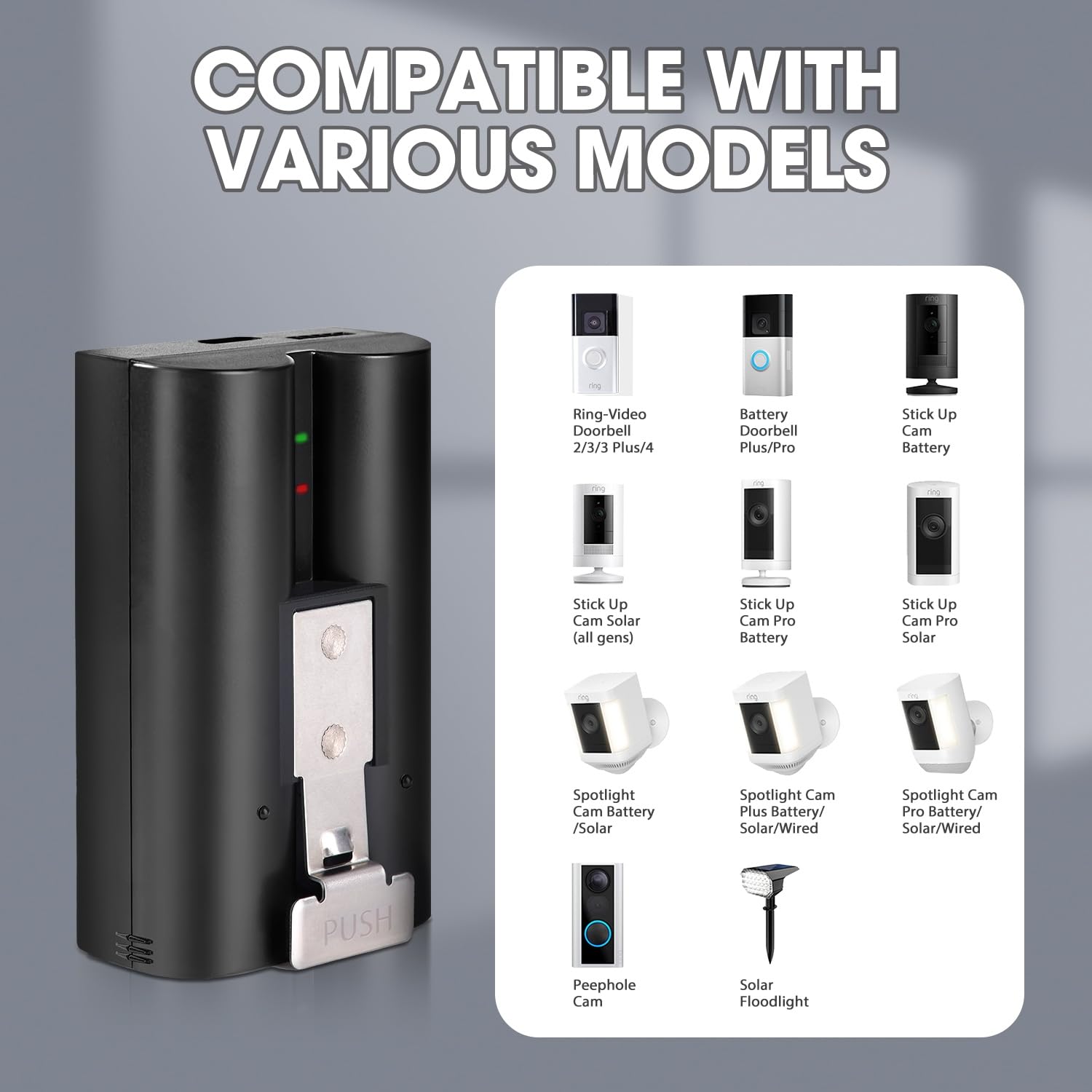 🔋【WIDELY COMPATIBLE】:Keep all your devices running! Works with major brands like Ring (Doorbell 2/3+/4, Spotlight Cam) and is also fully compatible with third-party devices like Solar Floodlights.