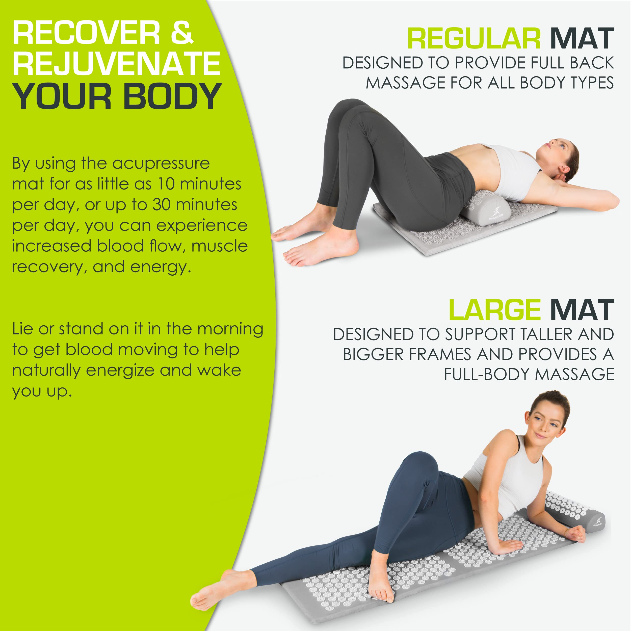 The ProsourceFit Acupressure Mat and Neck Pillow Set is an effective and affordable home remedy for muscle discomfort, stress, insomnia and more. The foam bed and thickness of the neck pillow have plastic needles covering thousands of acupressure points. Choose the regular acupressure mat with 8,910 acupressure points or the longer acupressure mat with 11,178 acupressure points. Acupressure therapy activates pressure points along your body’s meridian lines, stimulating and promoting healing. Ideal for muscle recovery during post-workout or during savasana at the end of a yoga session. Acupressure helps release tension in tight areas like the back, neck and feet.. The material is made of 100% cotton and plant-based eco foam which can be hand washed. The regular mat measures 26 1/2 by 16 1/2 inches and the longer version measures 51 by 19 inches. Both pillows are 14 3/4 by 5 3/4 inches. Both mats provide full back coverage while the longer mat provides coverage from the back to the legs which can be more suitable for someone taller and better for a full-body massage session.