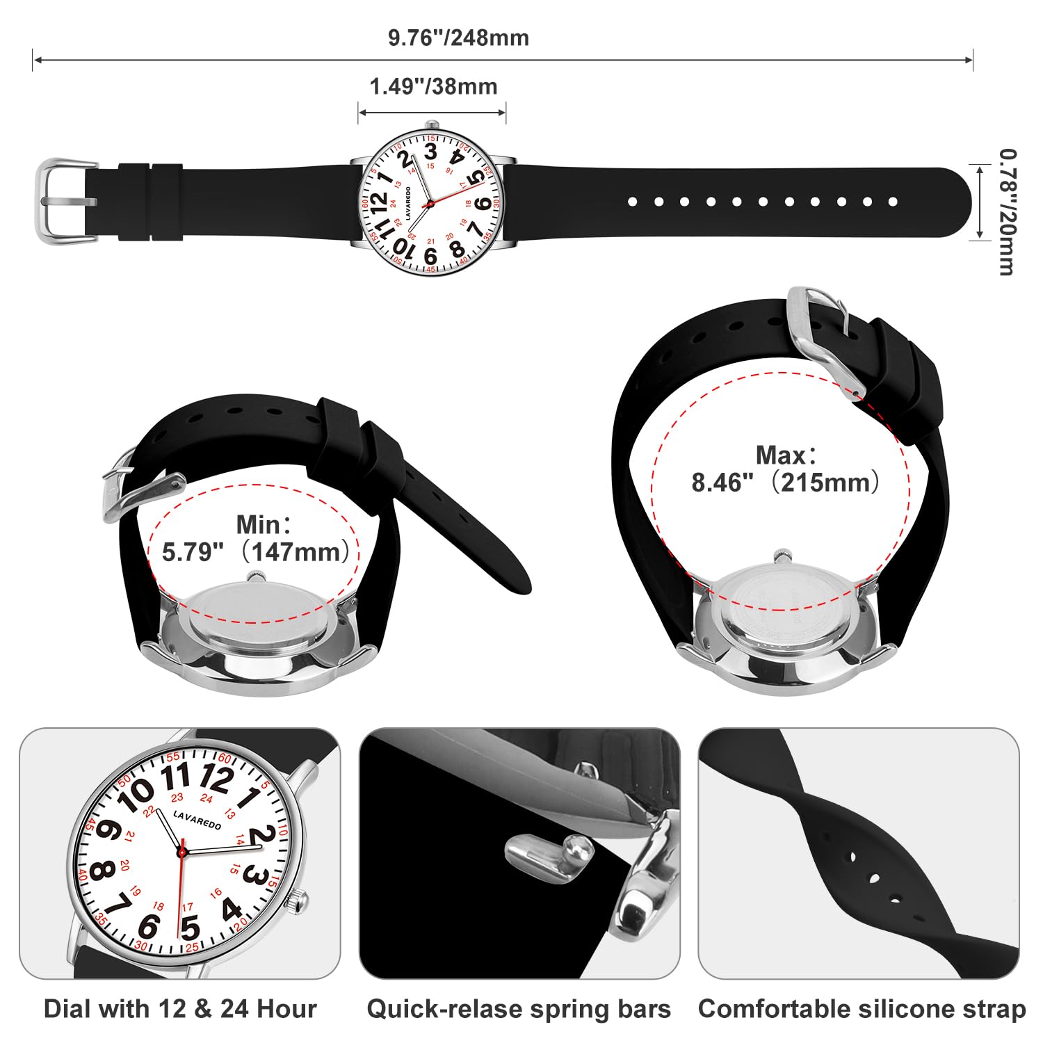 EasyRead & Military Time:Easy-to-read dial with 12/24 hour,luminescent face and MINUTE/HOUR hand for night-time visibility.The soft silicone strap is extremely comfortable to wear and the lightweight size is perfect for use at work