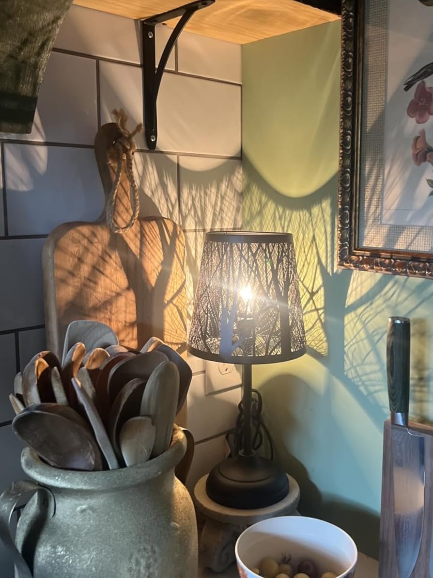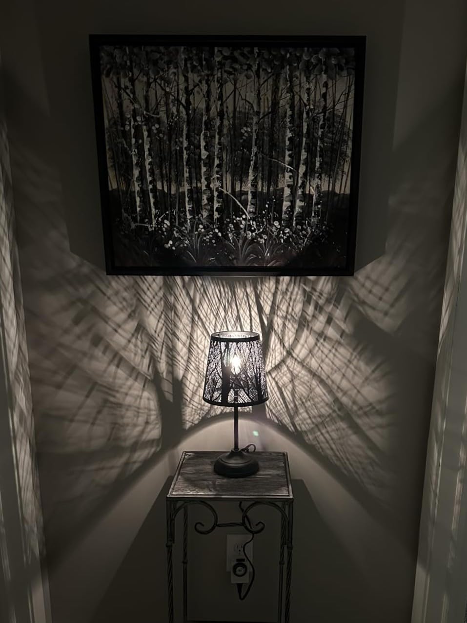 【Unique Forest Tree Shadow Ambiance & Art Decor】Hollowed tree-patterned shade casts a mesmerizing natural forest silhouette on walls/ceilings, making this black table lamp a standout decorative lamp. Its vintage black metal design blends rustic and modern styles, serving as an eye-catching accent lamp and a perfect addition to indoor halloween lights. This vintage table lamp is ideal for elevating the mood lighting in your bedroom, guest room, or living room.