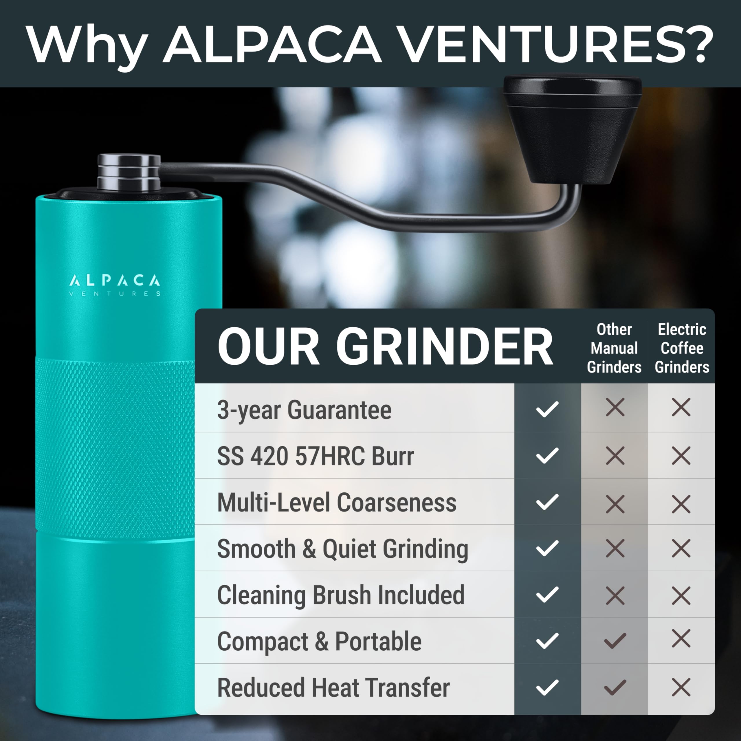EASY DISASSEMBLING, CARRYING AND CLEANING – A simple twist can separate the parts for cleaning, no tool needed. A lightweight coffee grinder with a sense of luxury portability makes it ideal for outdoor use. Easy apart off cleaning thoroughly without any device. It is relatively easy to disassemble the coffee beans grinder for cleaning. With an espresso grinder brush inside the burr for superior cleaning.