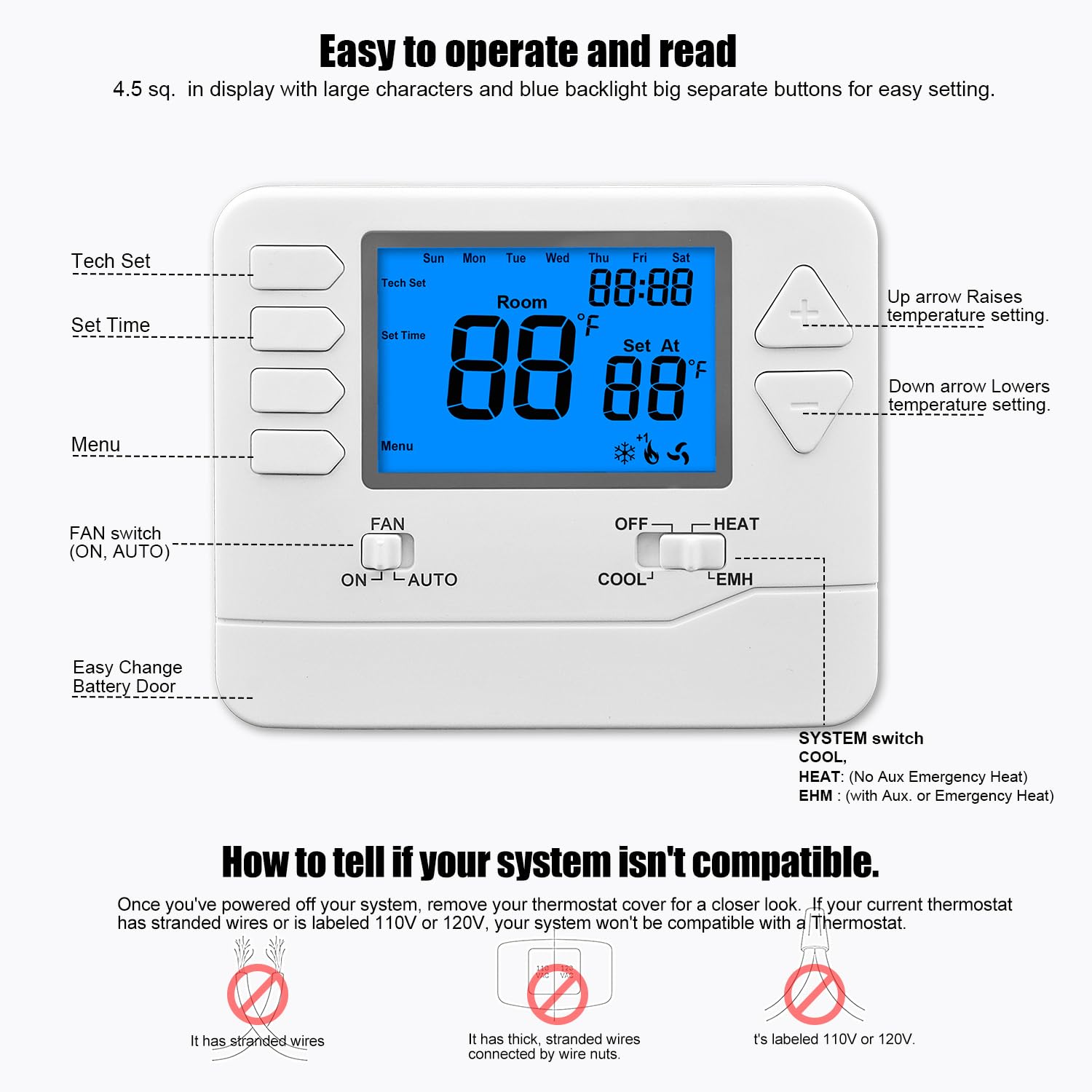 Not compatible with 110-240V electric heat systems (like electric baseboard heat, line voltage, convectors, radiant-ceiling heat). --- Does not work with conventional multistage systems, mini split systems and 12v rv thermostats.