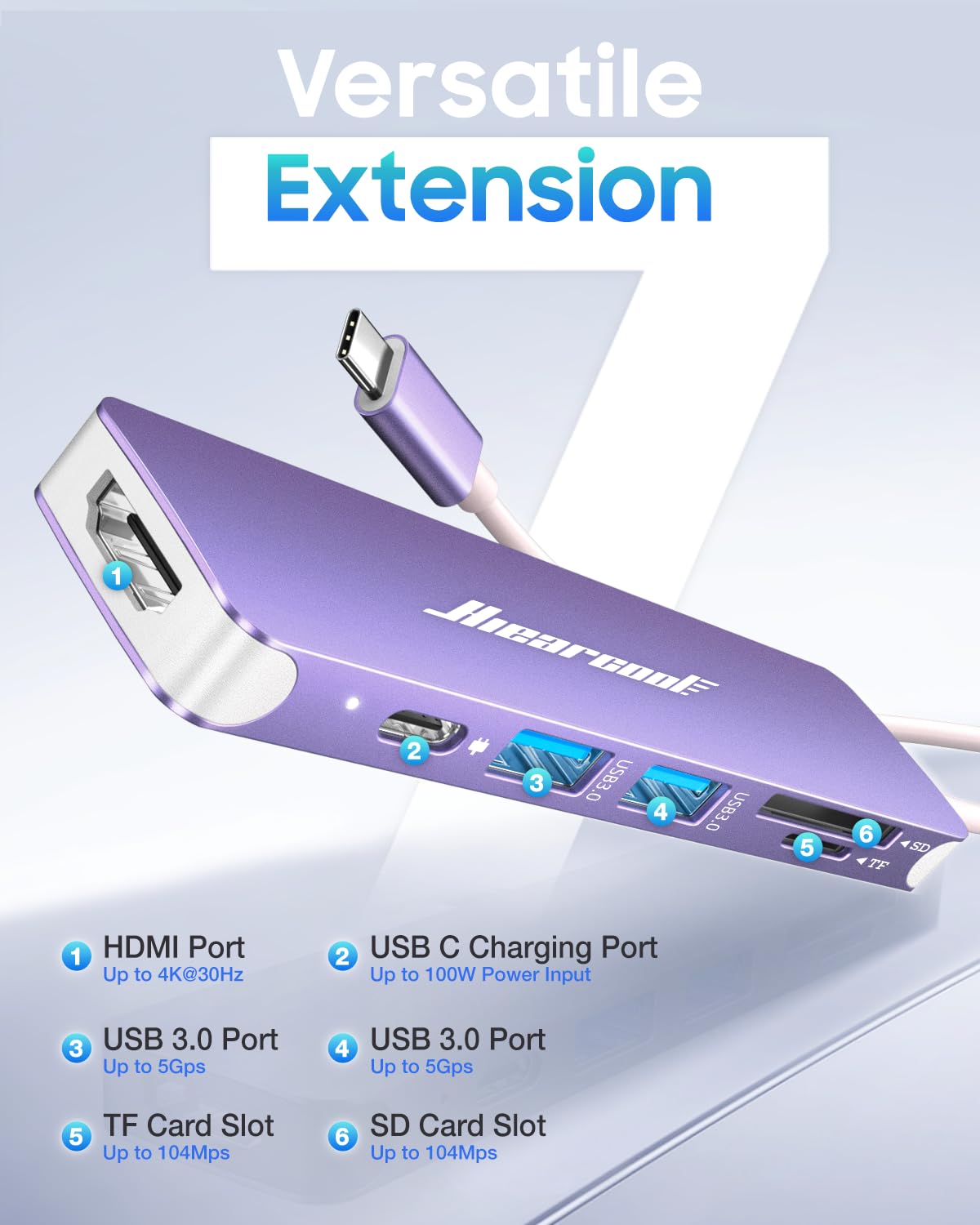 UL/SGS Approved USB C Hub (USB C adapter) – Expand one USB-C port to HDMI 4K@30Hz, 2× USB-A 3.0 (5Gbps), SD & microSD card slots, and USB-C PD pass-through (up to 100W) for everyday work and study