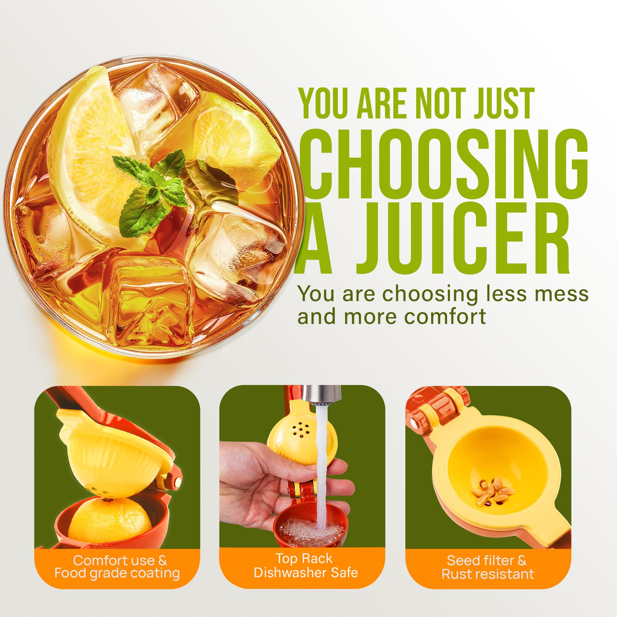 SQUEEZE OUT EVERY DROP OF JUICE: Our 2-in-1 lemon squeezer won’t waste a single drop from your favorite fruit! We have designed this lime juicer to be easy on hands. Watch limes, lemons, and small oranges beg for mercy, even with a soft squeeze. The holes at the bottom of the citrus juicer serve as a seed filter to prevent the pulp and seeds from getting in your way.