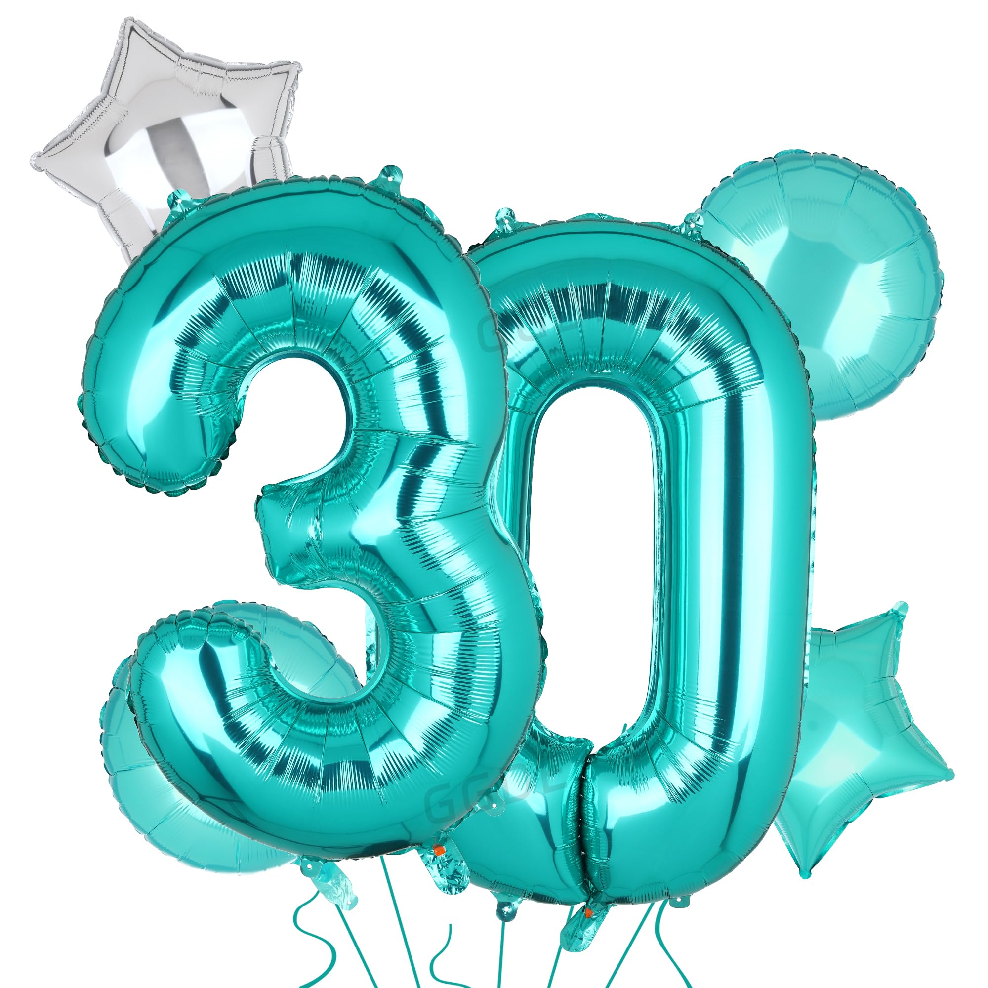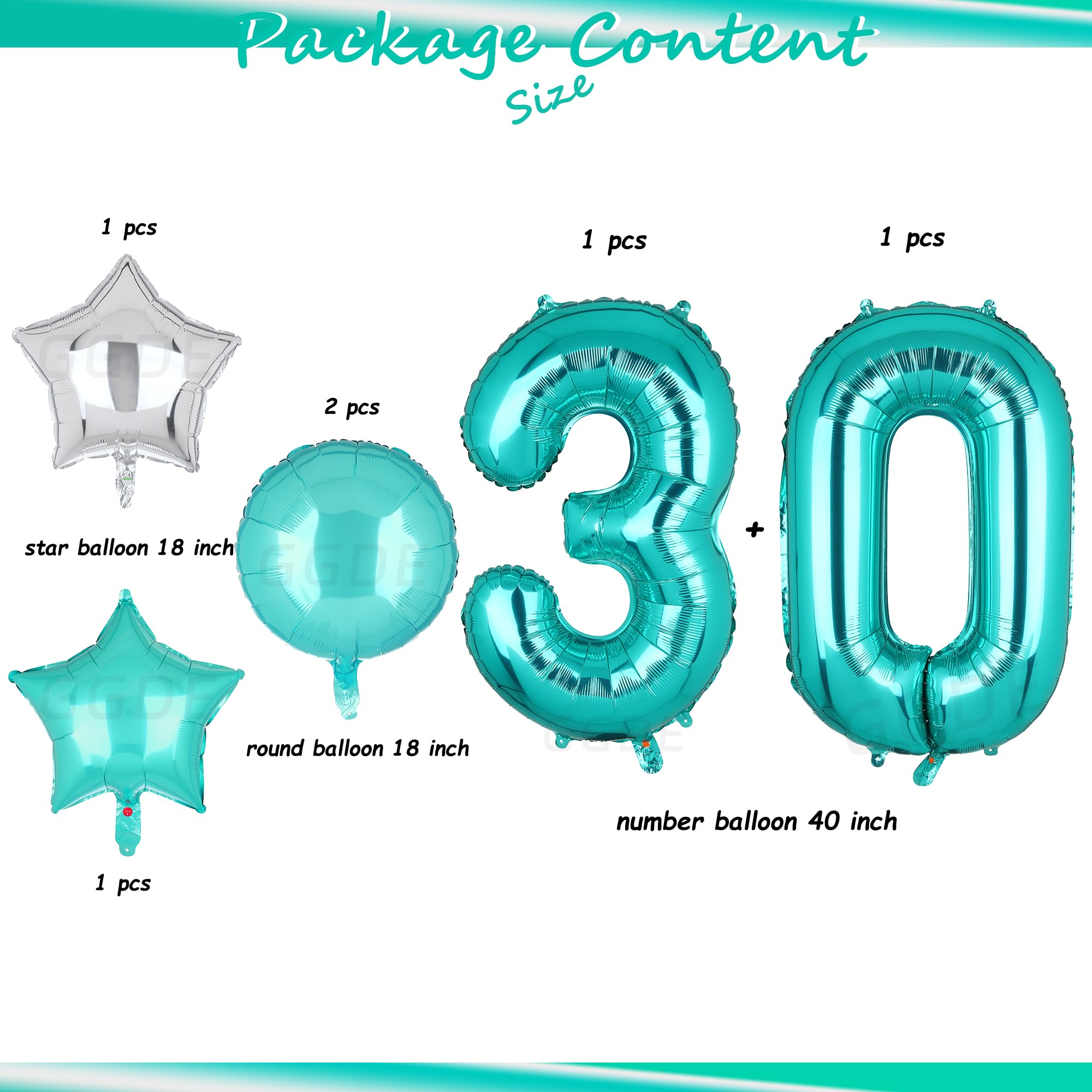 Package/Size: 1 pcs 40 inch teal number balloons 3+0,2 pcs star balloons (silver,teal),2 pcs round balloons (teal).