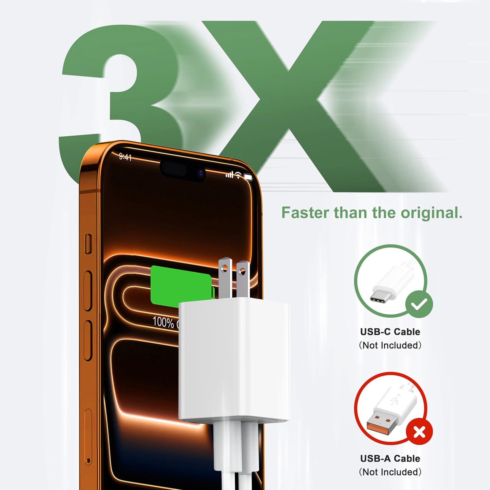 Dual Port Design Charger Cube: Two ports can fast charge two devices simultaneously at up to 20W, power up to 20W when a single device is connected. Boosted charging efficiency allows it to refuel iPad from 0% to 50% in only 40mins.(No cable included)