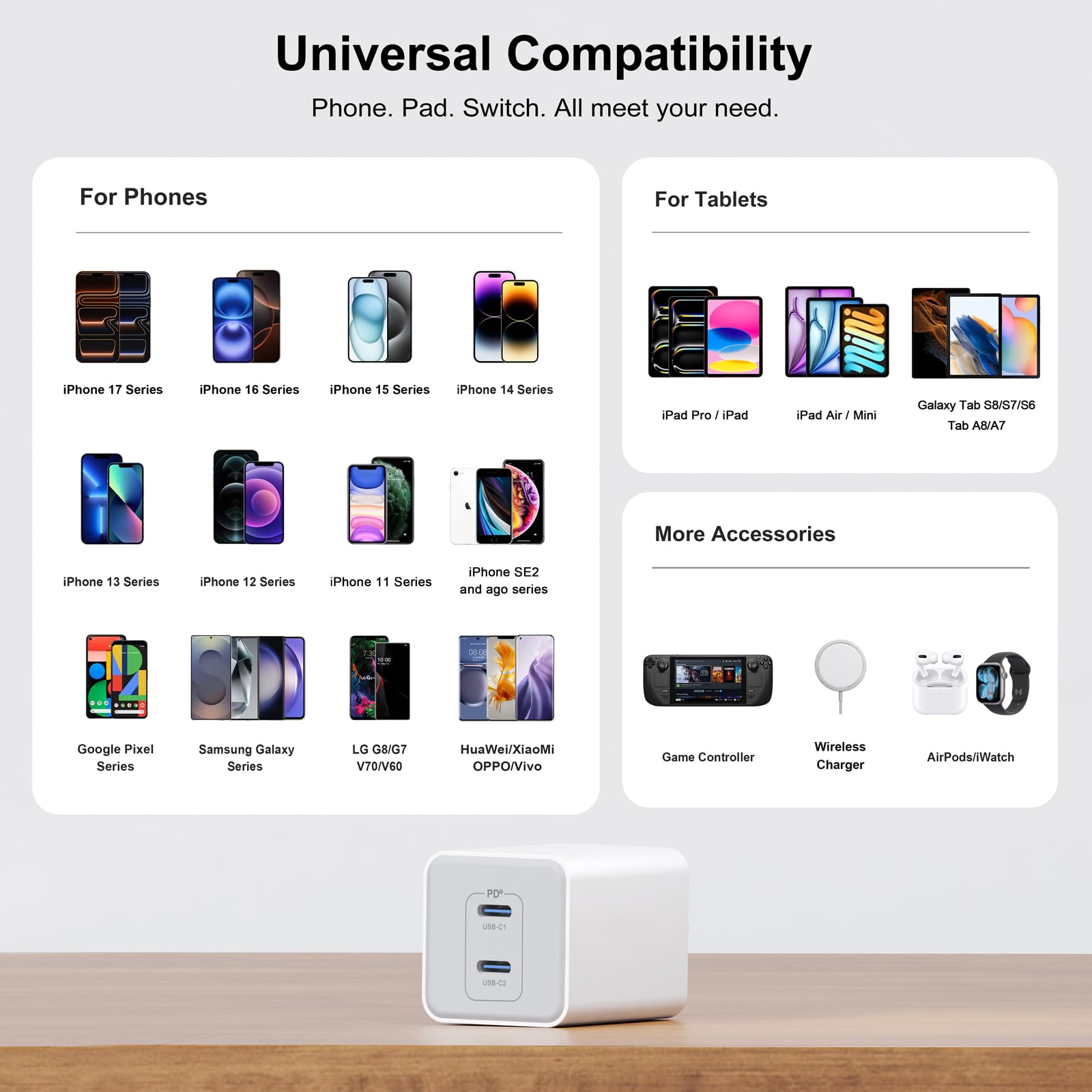Universal Compatibility: USB-C wall plug works flawlessly with all USB-C devices and lightning devices like iPhone 17/16/13/12/12 Mini/12 Pro/12 Pro Max/11/11 Pro/XS Max/XS/XR/X/8, iPad Pro, AirPods Pro,AirPods4,watch10 ultra2,Galaxy S21/S21+/S20/S10, Note 20/10, tablets, MacBook Air (2018), Wireless Earbuds and other USB-C tablets, etc.