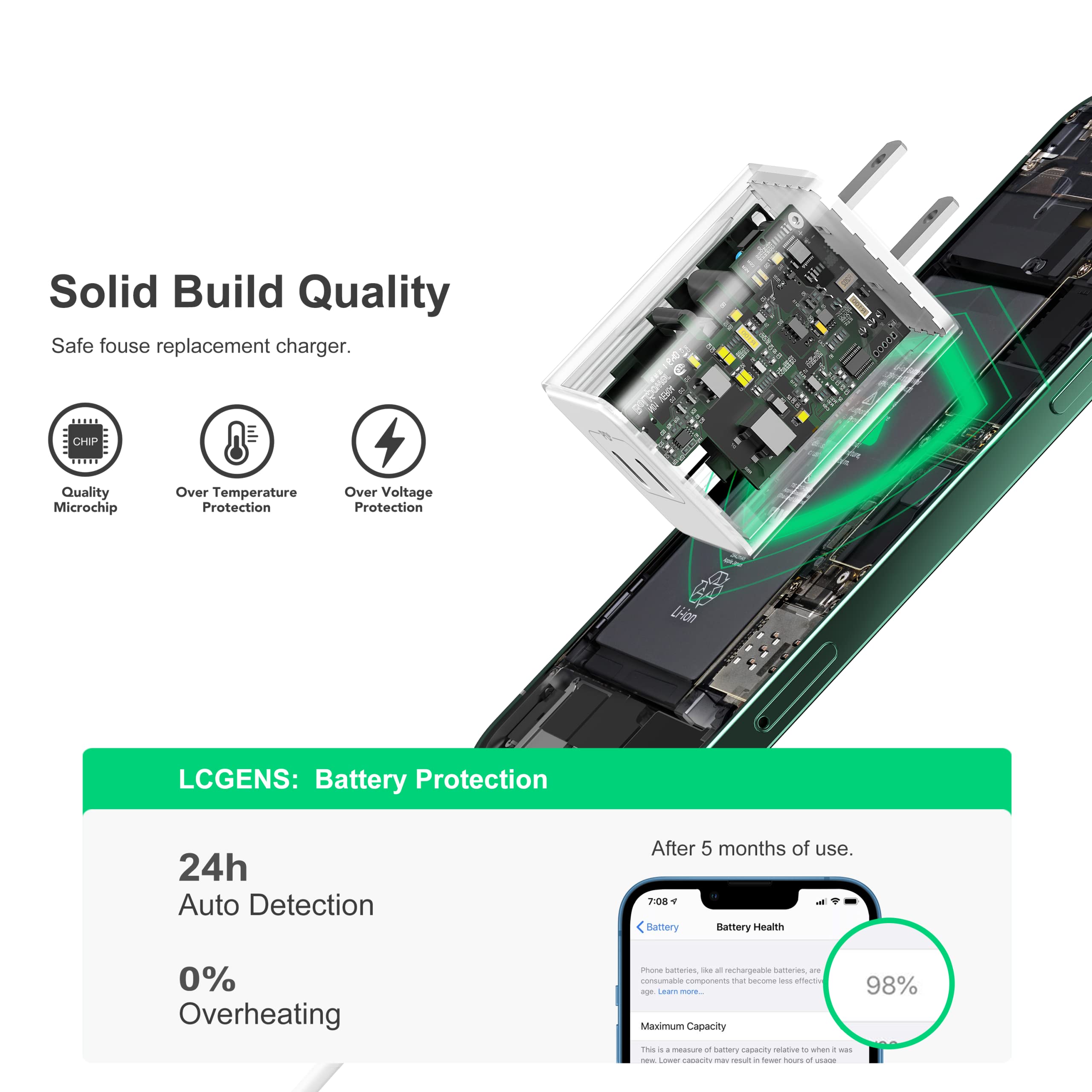 Safe Reliable Wall Plug: Equipped with a smart chip, which can adjust the input power of the phone to prevent the phone from overcharging and overheating.