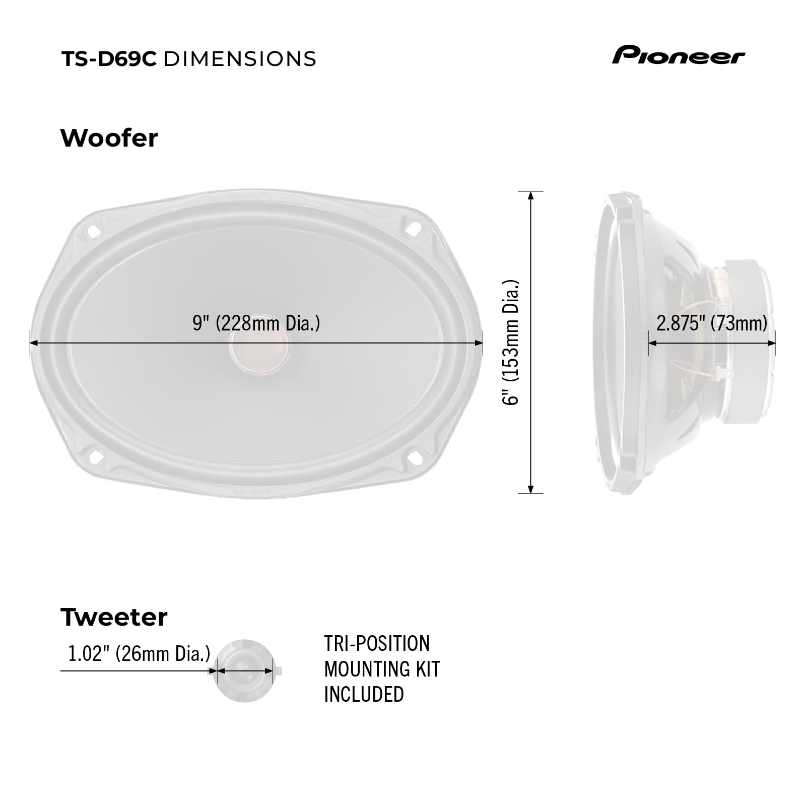 Tri-Position Mounting Kit - Pioneer’s tri-position mounting kit (included) provides the flexibility to mount the tweeter using a variety of methods; flush mount, surface mount or bracket mount.
