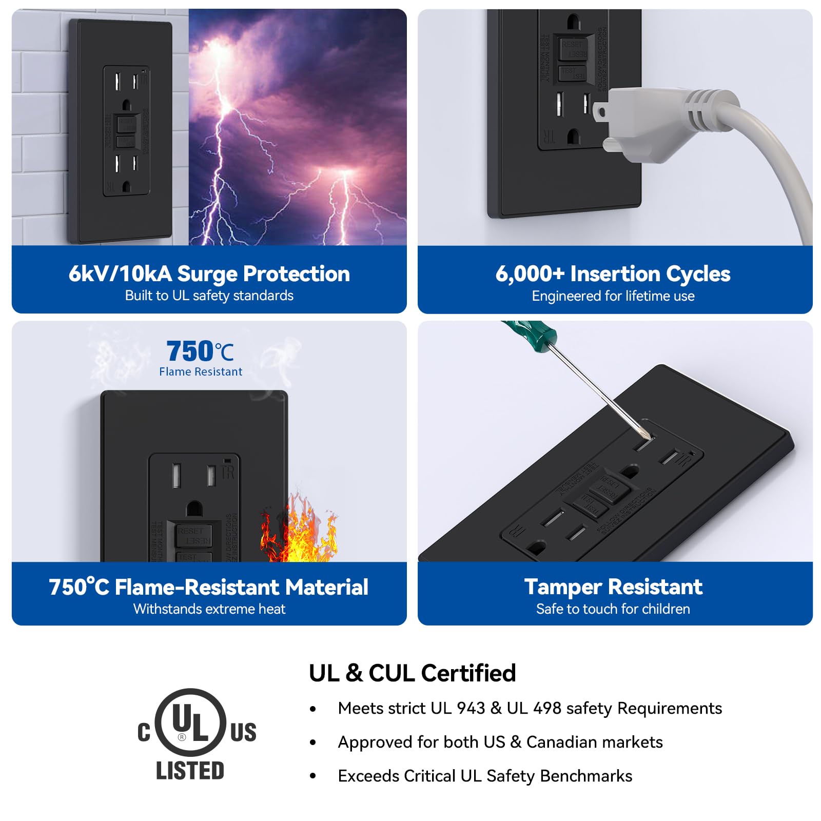 ✅【Durable and Ultra-Safe Design】Built with premium high-impact resistant thermoplastic materials. Endurance-tested over 6,000 times—twice the UL requirement. Features advanced safety features like 6kV surge protection, Reset-Disable, and Reversed Wiring Prevention to ensure long-lasting performance and maximum protection.