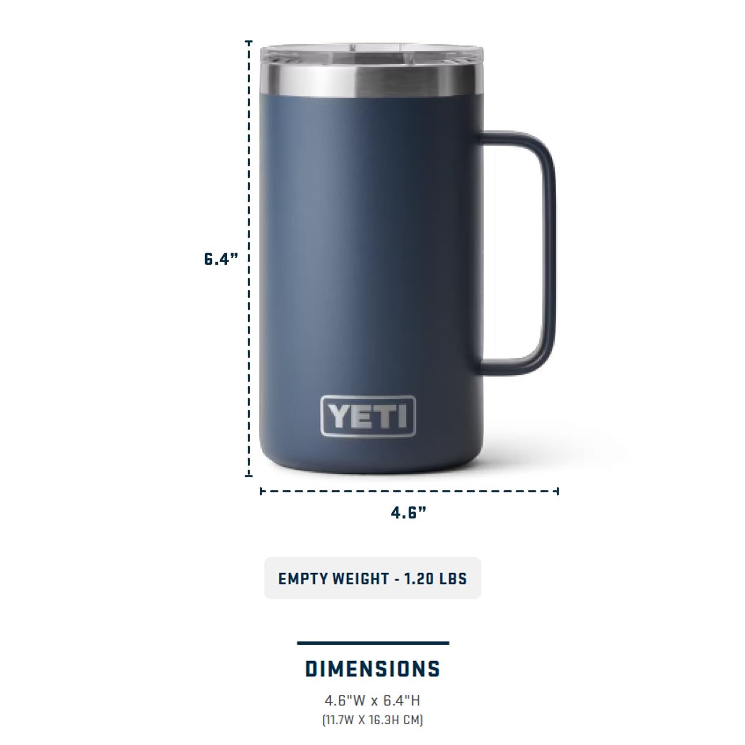 The YETI 24 oz. Rambler Mug stands 6.4 in high and has a lip diameter of 4.6 in, and with the handle its 5 inches wide