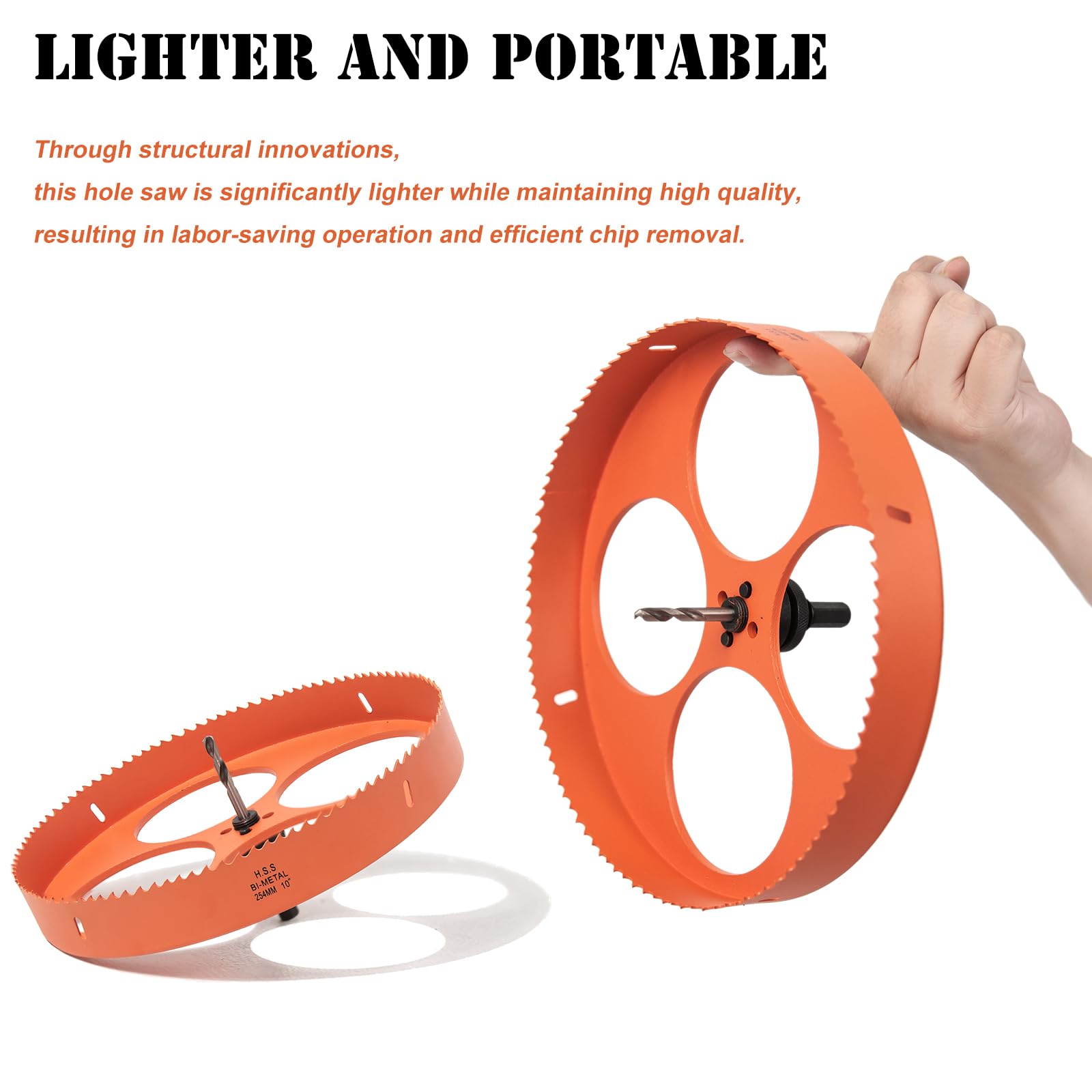 Package Includes: 1 pc 10" hole saw, 1 pc arbor with drill bit, 1 pc pilot drill bit (replacement), 1 pc hex key