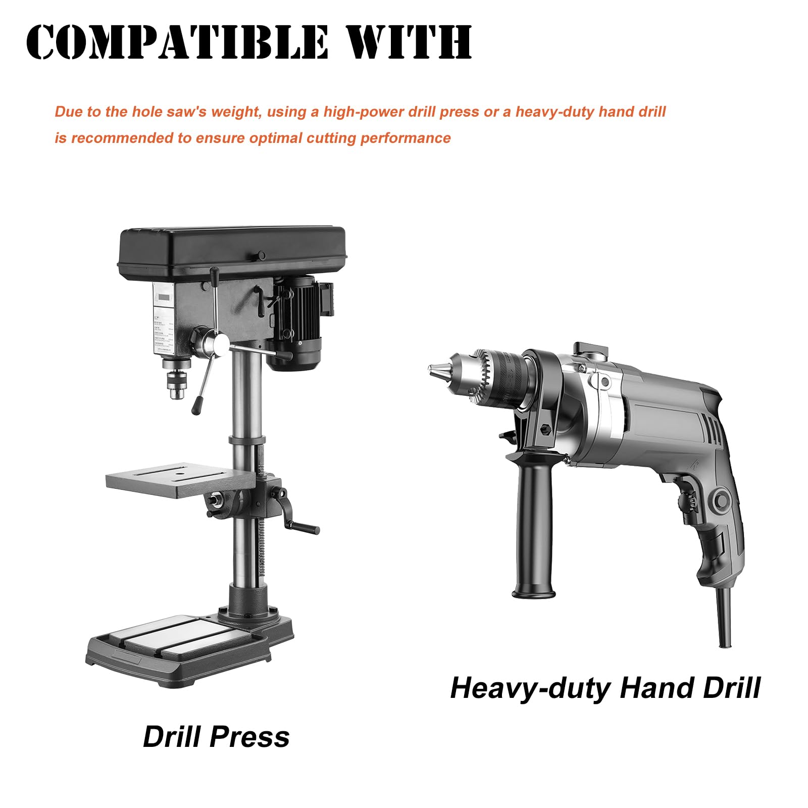 Compatible with: Due to the hole saw's weight of approximately 3 lbs, using a high-power drill press or a heavy-duty hand drill is recommended to ensure optimal cutting performance