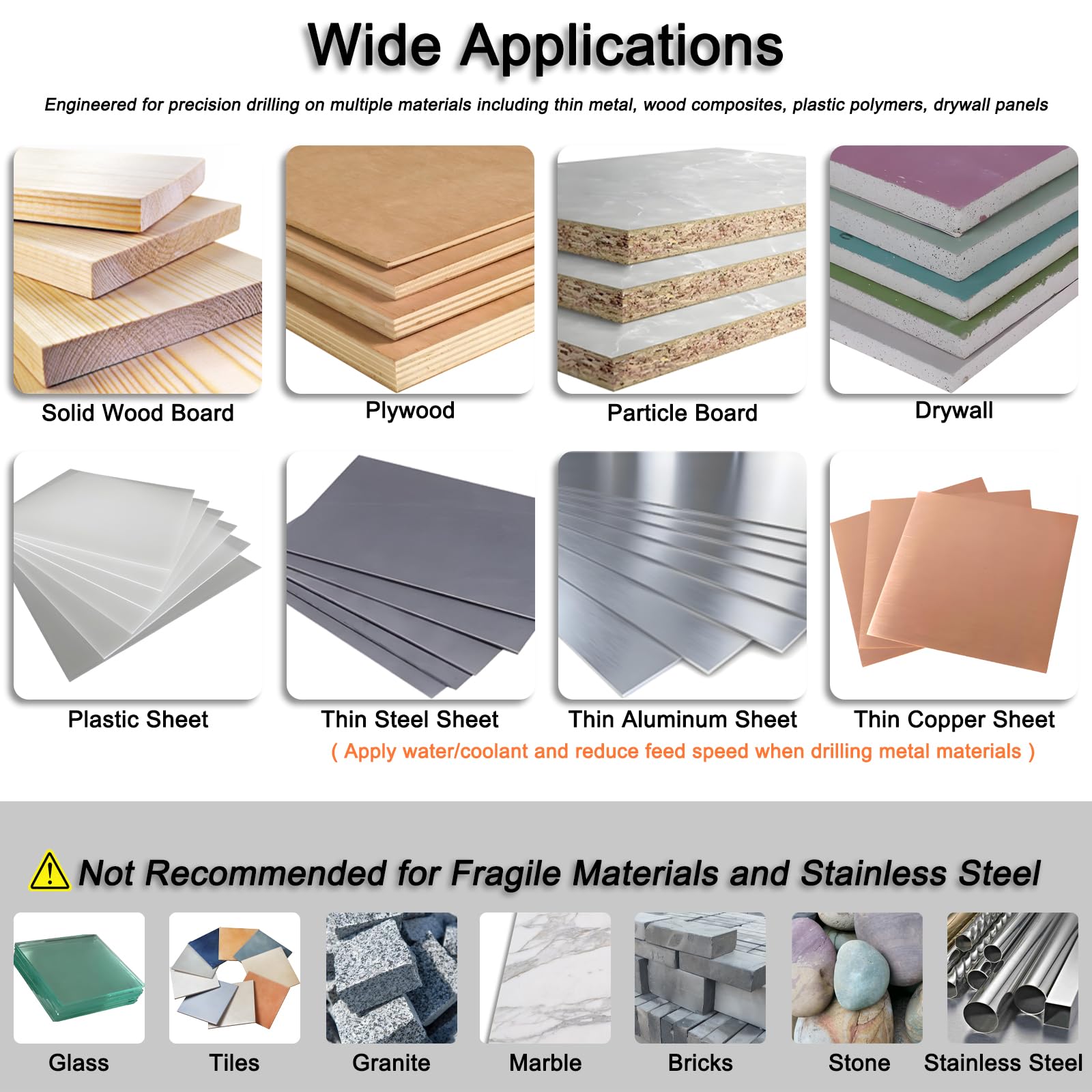 Wide Applications: Engineered for precision drilling on multiple materials including wood composites, plastic polymers, drywall panels, thin metal (except stainless steel), but not for fragile surfaces including glass, ceramic, tiles, granite, marble, porcelain, bricks, masonry, or natural stone to prevent chipping