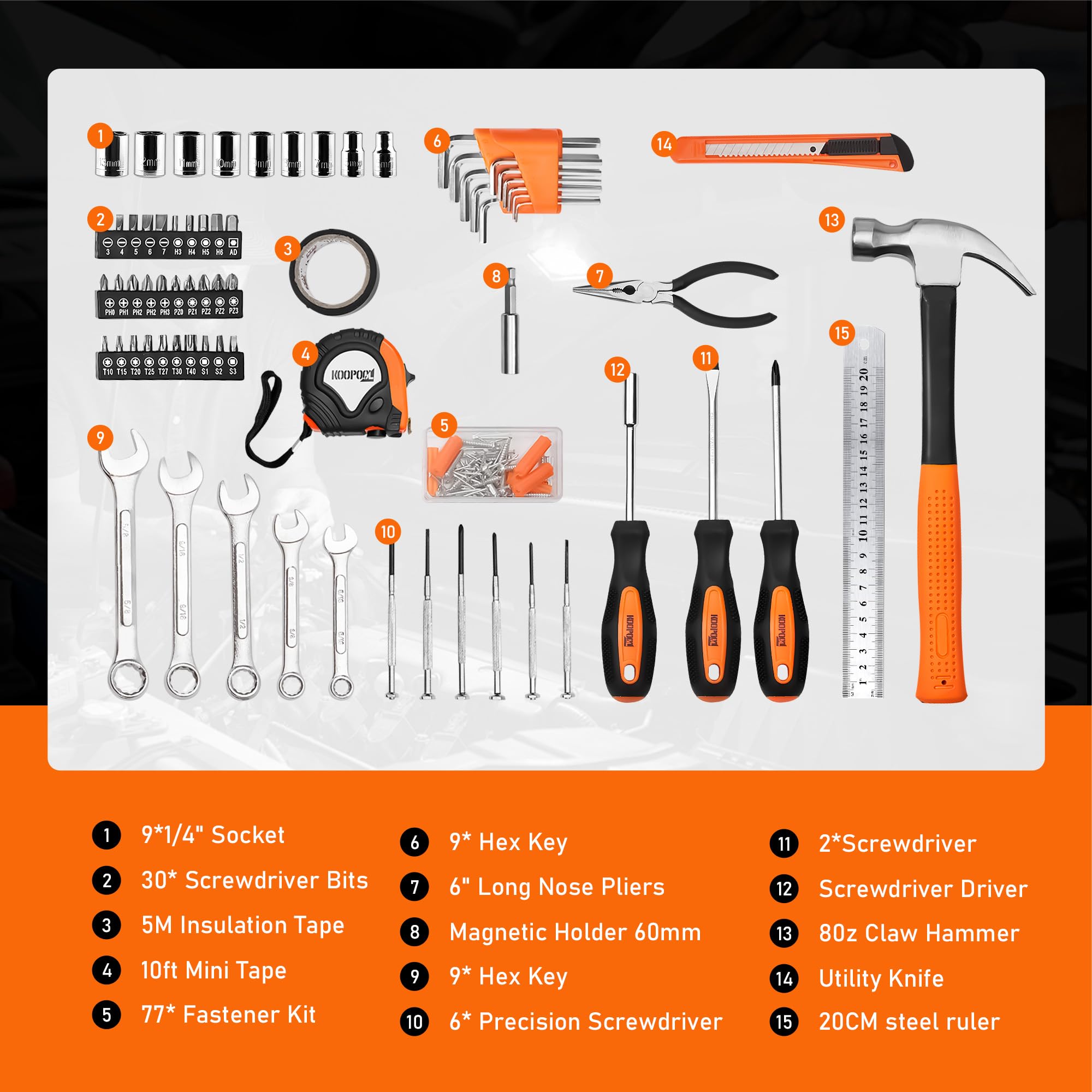 Comprehensive: This 149-piece set includes everything needed for small repairs and DIY projects; features a hammer, pliers, screwdrivers, and a tape measure