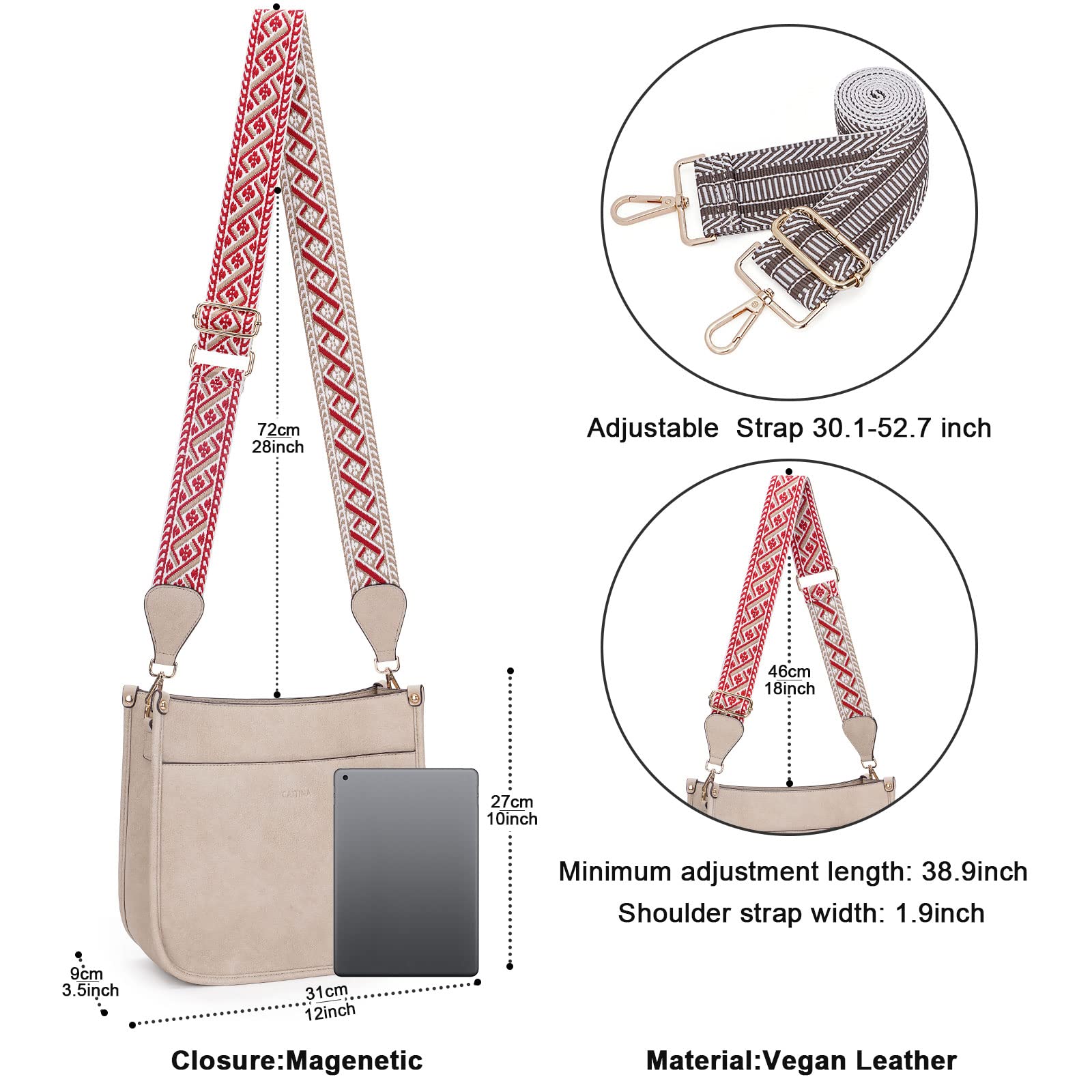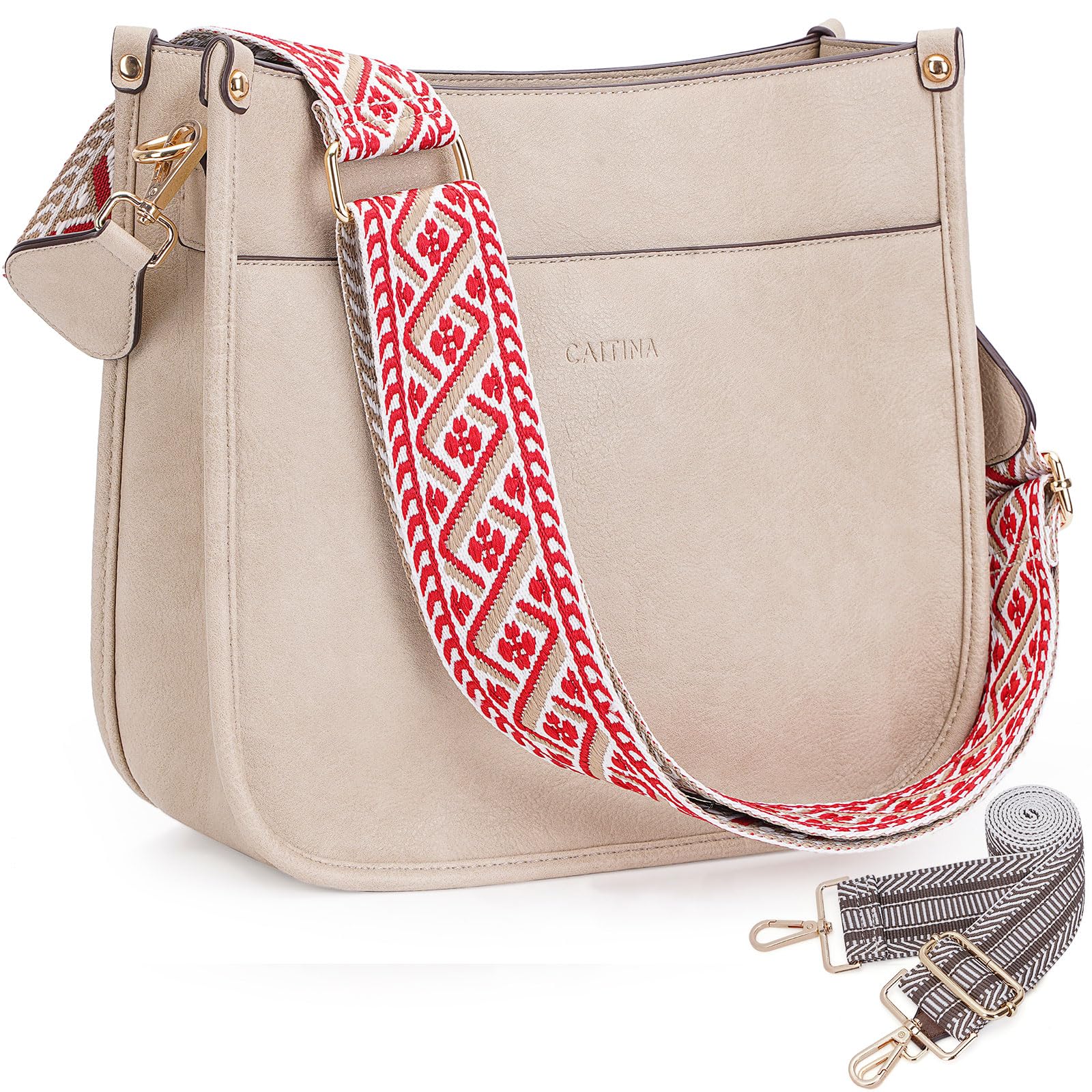 2-PCS Adjustable Removable Straps:Each CAITINA women's hobo handbag is equipped with 2 adjustable removable crossbody wide shoulder straps :1 weaving shoulder strap + 1 boho style strap,the strap is equipped with a gold metal clip attachment for easy clipping to any ladies cross body bag,that can be easily changed out quickly to give your bag a different look